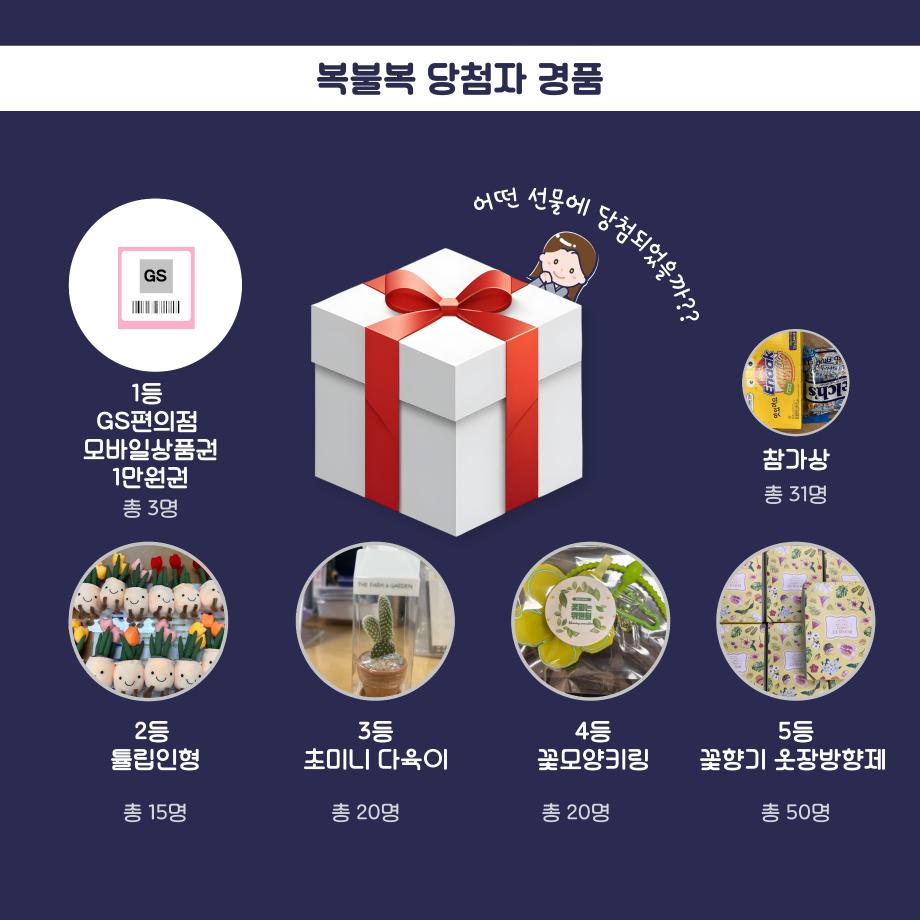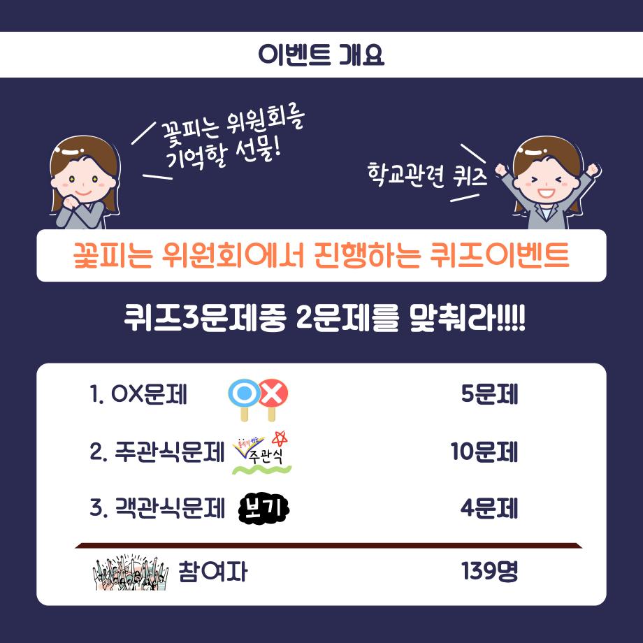 내용 : 꽃피는 위원회는 우리 위원회 및 학생위원회를 알리기 위하여 위원회 퀴즈이벤트를 실시하였다. 총 139명의 구성원들이 참여하여 본교 및 위원회 관련 퀴즈를 풀고 복불복으로 경품을 수령하여 즐겁고 힐링되는 시간을 제공하였다.