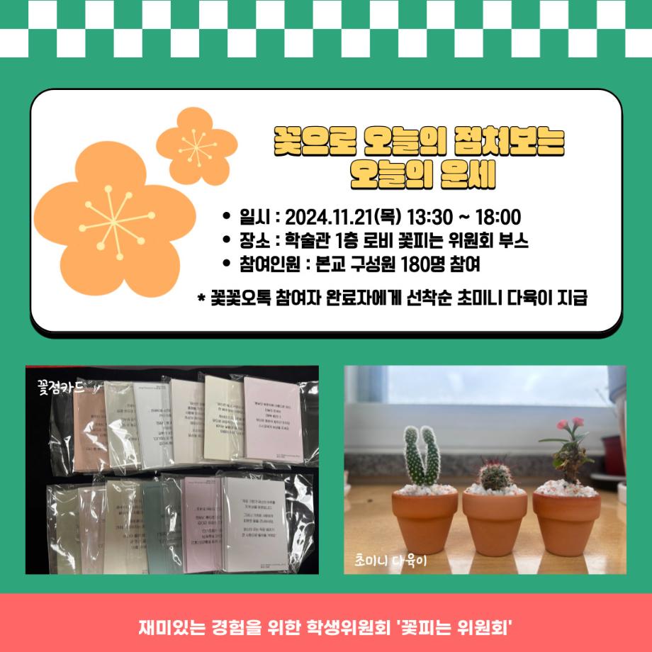본문 시작 홈으로 포토갤러리 학생위원회 개요 학생위원회 소개 공지사항 활동결과 홈페이지가이드 포토갤러리 페이스북 트위터 프린트 [꽃피는 위원회] 오늘의 운세 꽃꽃오톡 학생처 2111 2024-11-30 꽃피는 위원회 [오늘의 운세 꽃꽃오톡] 일시 : 2024.11.21(목) 13:30 ~ 재료소진시 까지 장소 : 학술관 1층 학생위원회 부스 참여조건 : 꽃피는 위원회 활동 만족도 조사 참여자 내용 : 랜덤돌리기를 통한 꽃운세를 점쳐보고 선착순 초미니 다육이 선물받기 참여인원 : 본교 구성원 180명 참여 목록 다음 용감한 위원회 「최종보고회」 홍보부스 운영 다음 [용감한 위윈회]나만의 하바리움, 공방 창업의 시작! 담당부서 : 장학복지팀 담당자 : - 연락처 : 043-649-1142 최종수정일 : 2024-10-26 만족도조사 만족도 조사 이 페이지에서 제공하는 정보에 대하여 만족하시나요? 매우만족 만족 보통 불만족 매우불만족