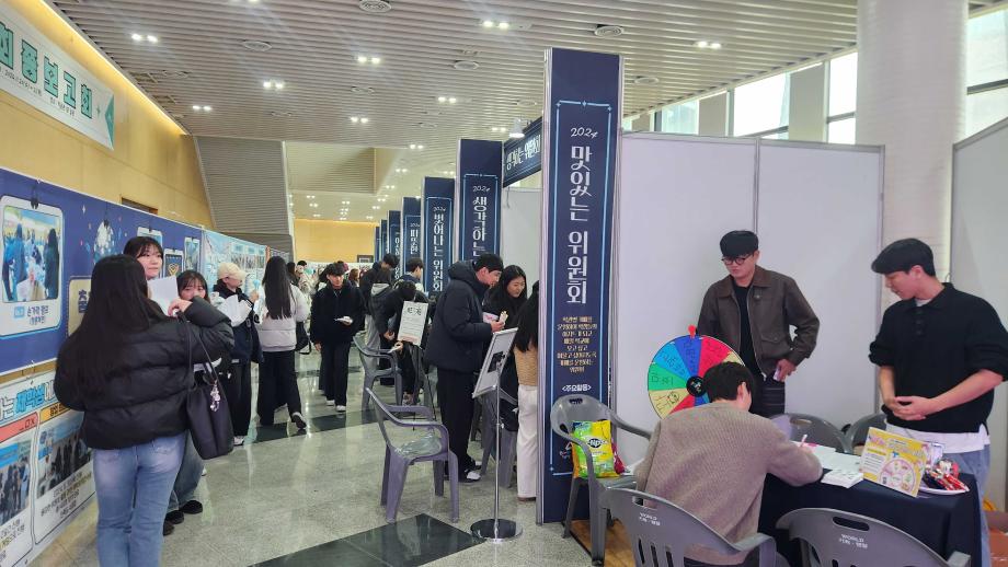 본문 시작 홈으로 포토갤러리 학생위원회 개요 학생위원회 소개 공지사항 활동결과 홈페이지가이드 포토갤러리 페이스북 트위터 프린트 제 3기 학생위원회 최종보고회 학생처 1101 2024-12-31 <제 3기 최종보고회> 1. 일정 : 2024. 11. 20.(수) ~ 12. 08(일) 2. 장소 : 학술관 1층 일원 3. 내용 : 전시회, 세미나, 안내 및 홍보부스, 총괄이벤트 등 4. 참여 : 13개 학생위원회 및 본교구성원 3,469명 참여 목록 다음 [용감한 위윈회]나만의 하바리움, 공방 창업의 시작! 다음 [약속하는 위원회] 빛나는 약속 담당부서 : 장학복지팀 담당자 : - 연락처 : 043-649-1142 최종수정일 : 2024-10-26 만족도조사 만족도 조사 이 페이지에서 제공하는 정보에 대하여 만족하시나요? 매우만족 만족 보통 불만족 매우불만족