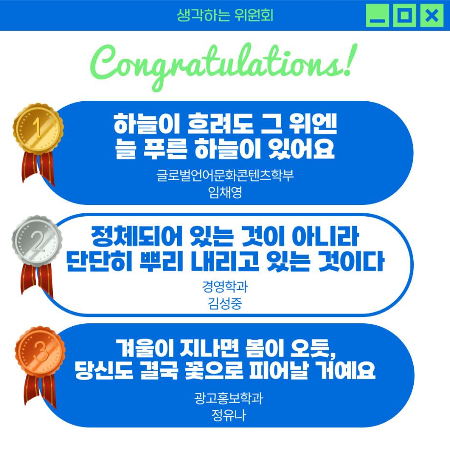 지난 1학기동안 진행된 대형 현수막 문구 공모전에 관심을 주시고 참여해주신 모든 분들께 감사의 말씀을 전합니다🤍