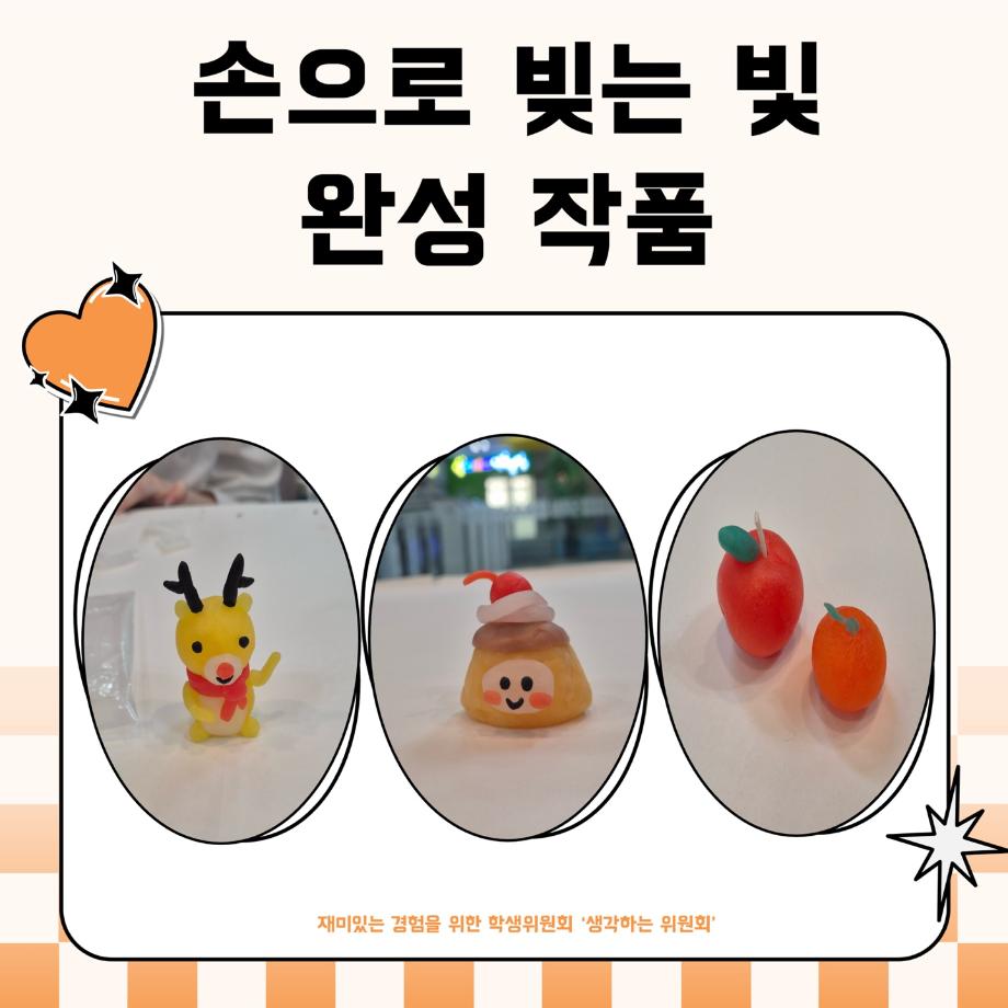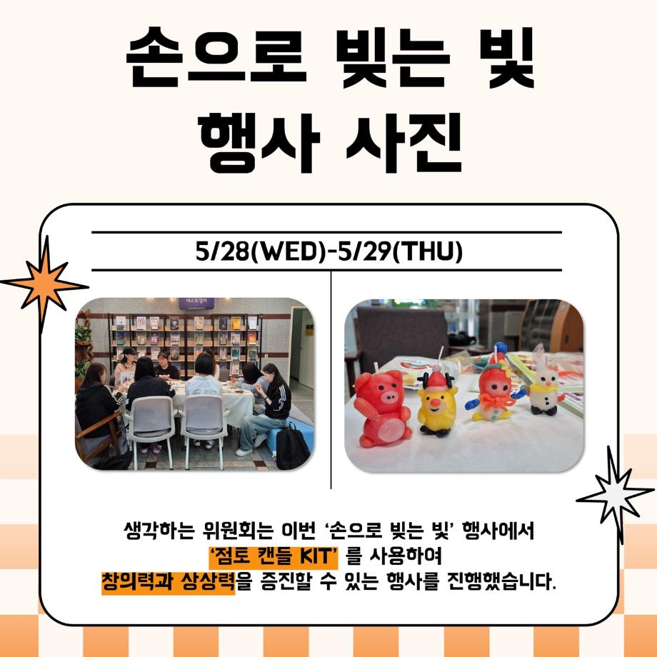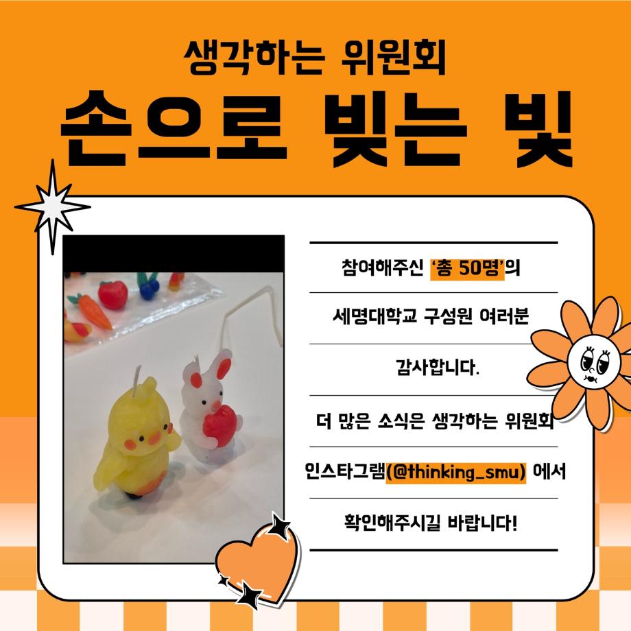 본문 시작 홈으로 포토갤러리 학생위원회 개요 학생위원회 소개 공지사항 활동결과 홈페이지가이드 포토갤러리 페이스북 트위터 프린트 [생각하는 위원회] 손으로 빚는 빛 학술정보원 1188 2025-05-30 프로그램명 : 손으로 빚는 빛 일시 : 2025년 5월 28일(수)~29일(목) 13:30~16:00 장소 : 도서관 2층 로비 활동내용 : 점토양초 DIY로 나만의 양초 만들기 행사 참여자 : 50명 안녕하세요! 재미있는 경험을 위한 학생위원회 '생각하는 위원회'입니다 :) 손으로 빚는 빛 행사에 참여해주신 모든 분들께 감사드립니다! 앞으로도 생각하는 위원회의 활동들에 많은 관심 부탁드립니다🤍 목록 다음 [생각하는 위원회] 대형 현수막 문구 공모전 'Hear, 위로' 다음 [약속하는 위원회] 뽕뽕오락실 담당부서 : 장학복지팀 담당자 : - 연락처 : 043-649-1142 최종수정일 : 2024-10-26 만족도조사 만족도 조사 이 페이지에서 제공하는 정보에 대하여 만족하시나요? 매우만족 만족 보통 불만족 매우불만족