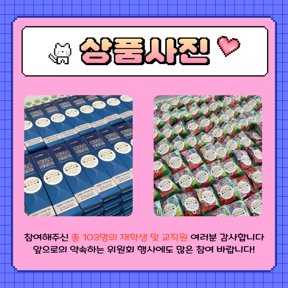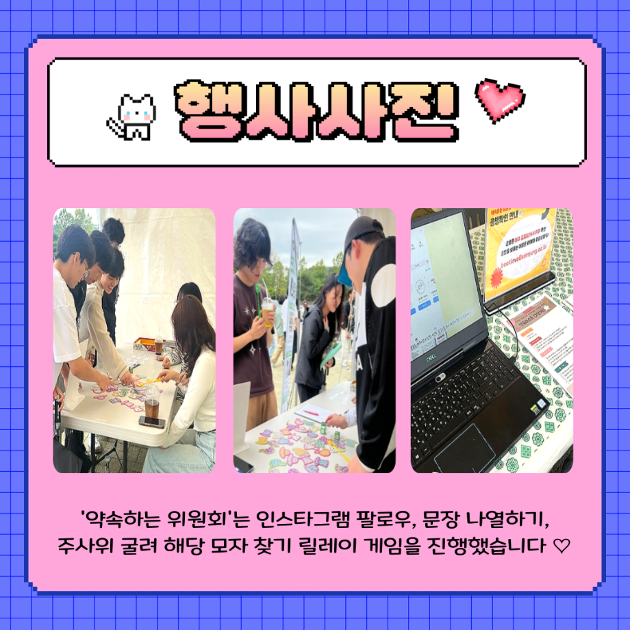 본문 시작 홈으로 포토갤러리 학생위원회 개요 학생위원회 소개 공지사항 활동결과 홈페이지가이드 포토갤러리 페이스북 트위터 프린트 [약속하는 위원회] 뽕뽕오락실 학술정보원 561 2025-09-24 안녕하세요 재미있는 경험을 위한 학생위원회 '약속하는 위원회' 입니다! 약속하는 위원회 행사인 뿅뿅! 약속오락실! 활동이 성황리에 마무리 되었습니다 :) [뿅뿅! 약속오락실! 행사 결과] 일시 : 2025년 9월 24일(수) 14시~17시 장소 : 학생회관 앞 광장 행사 참여자 : 103명 뿅뿅! 약속오락실! 행사에 참여해주신 모든 분들께 진심으로 감사드립니다! 추후에 이어질 약속하는 위원회 활동도 많은 관심 바랍니다! 목록 이전[생각하는 위원회] 손으로 빚는 빛 다음 [꽃피는 위원회] 꽃 돌려라 피어라 담당부서 : 장학복지팀 담당자 : - 연락처 : 043-649-1142 최종수정일 : 2024-10-26 만족도조사 만족도 조사 이 페이지에서 제공하는 정보에 대하여 만족하시나요? 매우만족 만족 보통 불만족 매우불만족