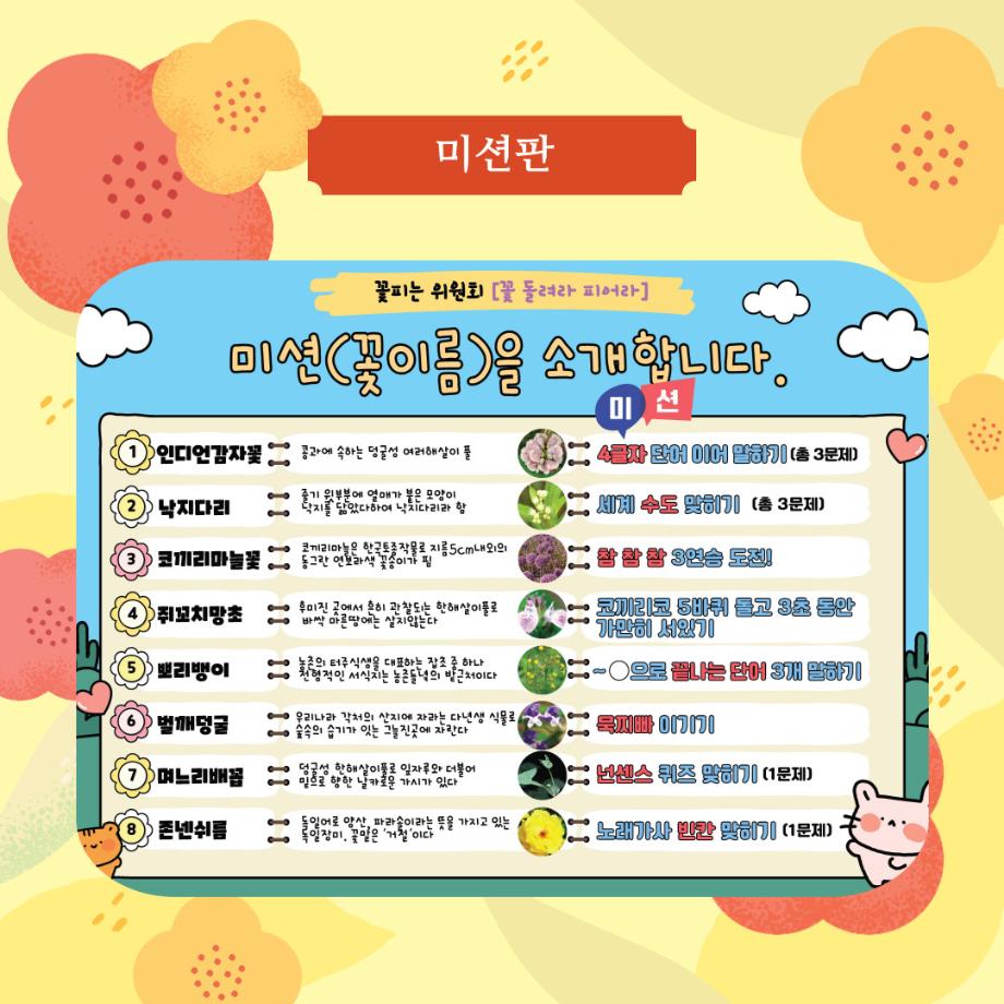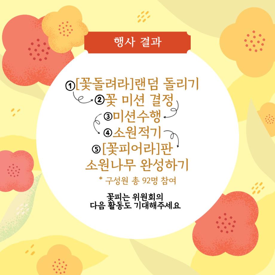 본문 시작 홈으로 포토갤러리 학생위원회 개요 학생위원회 소개 공지사항 활동결과 홈페이지가이드 포토갤러리 페이스북 트위터 프린트 [꽃피는 위원회] 꽃 돌려라 피어라 학생처 768 2025-09-24 꽃피는 위원회 [꽃 돌려라 피어라] 행사 결과 1. 일시: 2025.09.24 11:00~14:00(3시간) 2. 장소: 학생회관 앞 광장 학생위원회 부스 3. 참여인원: 구성원 92명 참여 다음 활동도 많은 기대 부탁드립니다. 목록 이전[약속하는 위원회] 뽕뽕오락실 다음 [약속하는,생각하는 위원회] 세명파티시에 담당부서 : 장학복지팀 담당자 : - 연락처 : 043-649-1142 최종수정일 : 2024-10-26 만족도조사 만족도 조사 이 페이지에서 제공하는 정보에 대하여 만족하시나요? 매우만족 만족 보통 불만족 매우불만족