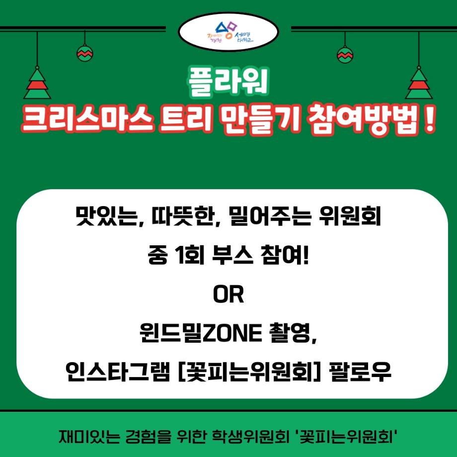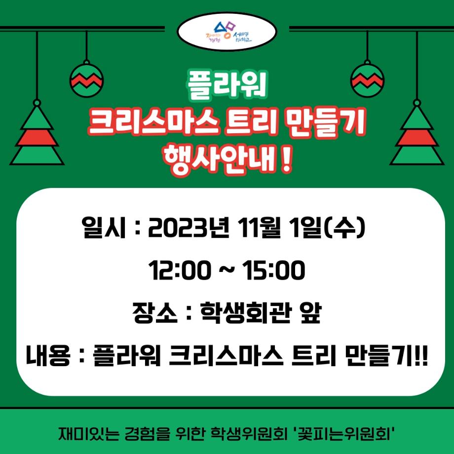 본문 시작 홈으로 공지사항 학생위원회 개요 학생위원회 소개 공지사항 활동결과 홈페이지가이드 프로그램 계획 프로그램 계획 세명대학교 공지사항 프로그램 계획 페이스북 트위터 프린트 [꽃피는 위원회] 플라워트리 만들기 학생처 2483 2023-11-01 미리크리스마스 플라워트리만들기 행사 일시 : 2023.11.01 12:00 ~ 15:00 장소 : 학생회관 앞 광장 목록 이전[통하는 위원회] MZ골든벨 다음 [따뜻한 위원회] 따뜻한 마음은 참(charm) 좋아 담당부서 : 장학복지팀 담당자 : - 연락처 : 043-649-1142 최종수정일 : 2024-10-26 만족도조사 만족도 조사 이 페이지에서 제공하는 정보에 대하여 만족하시나요? 매우만족 만족 보통 불만족 매우불만족