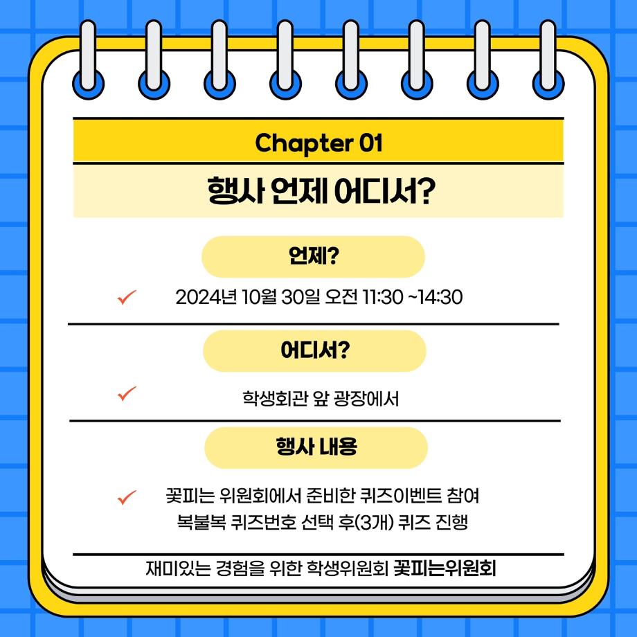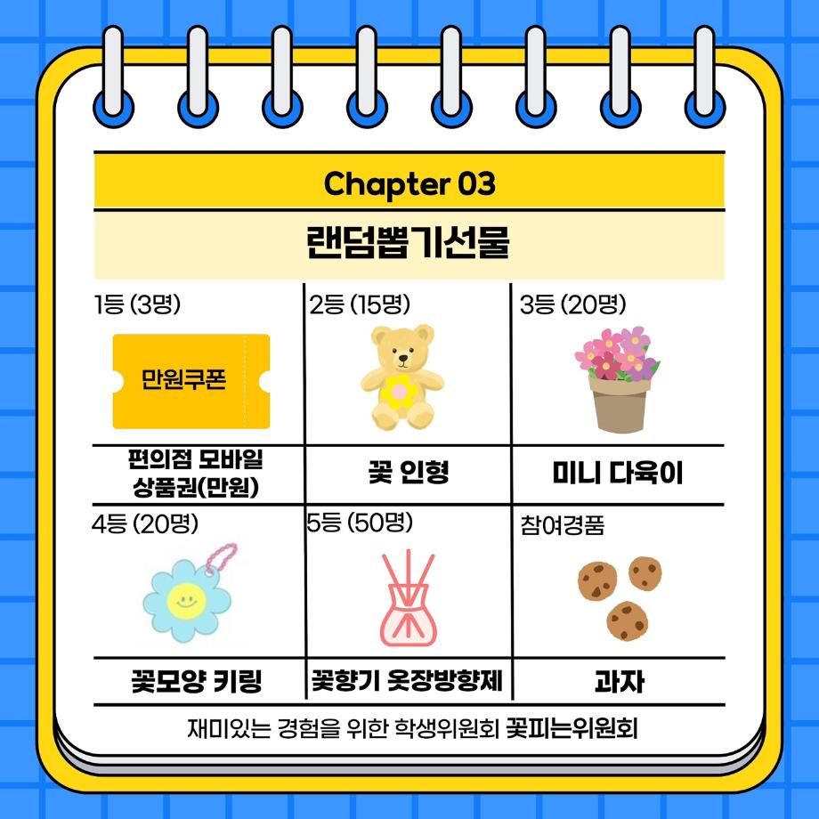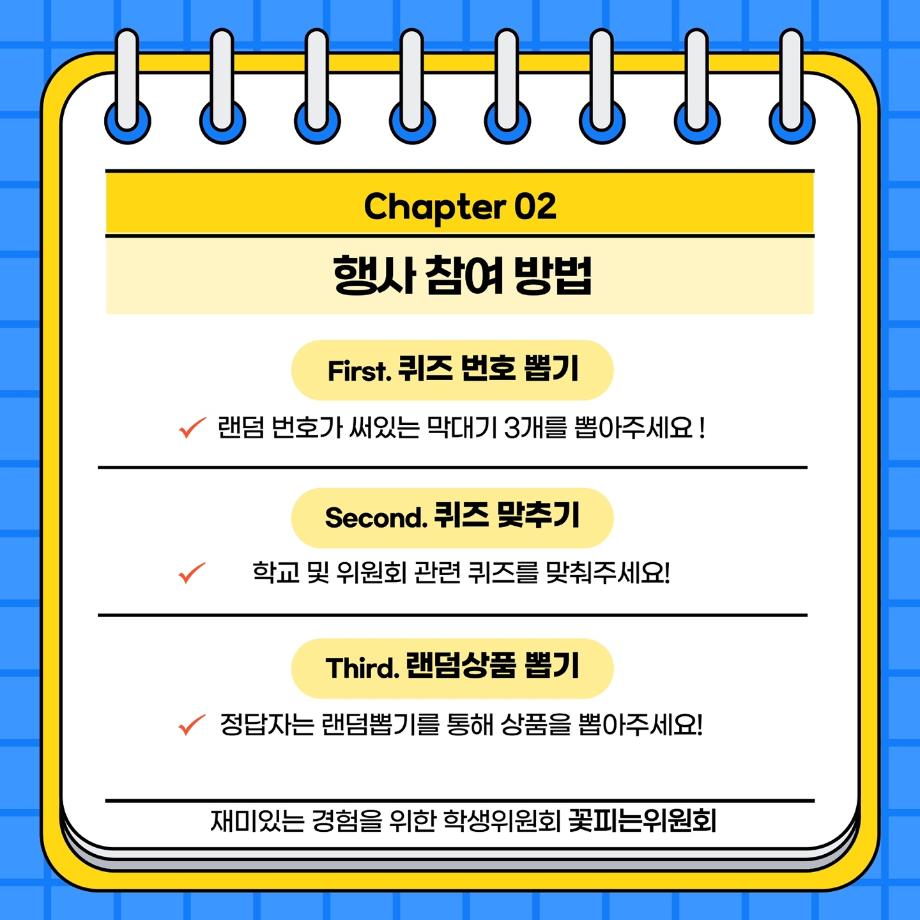 본문 시작 홈으로 공지사항 학생위원회 개요 학생위원회 소개 공지사항 활동결과 홈페이지가이드 프로그램 계획 프로그램 계획 세명대학교 공지사항 프로그램 계획 페이스북 트위터 프린트 [꽃피는 위원회] 퀴즈이벤트 YOU QUIZ? 학생처 1352 2024-10-30 꽃피는 위원회에서는 학생위원회를 알리고 꽃피는 위원회 활동을 홍보하기위하여 아래와 같이 퀴즈이벤트를 실시합니다. 많은 참여부탁드립니다. 일시 : 2024.11.30(수) 11:30 ~ 14:30 장소 : 학생회관 앞 광장 참여방법 1) 복물복 퀴즈문제 선택(3문제) 2) 선택한 퀴즈풀기 3) 2문제 이상 정답자는 복불복 경품추첨기회(1등~5등) 제공 4) 1문제 이하 정답자는 과자 또는 젤리 선물 목록 이전[따뜻한 위원회] 아기세룡 반갑세룡 다음 -용감한 위원회] 도전! 인테리어창업 담당부서 : 장학복지팀 담당자 : - 연락처 : 043-649-1142 최종수정일 : 2024-10-26 만족도조사 만족도 조사 이 페이지에서 제공하는 정보에 대하여 만족하시나요? 매우만족 만족 보통 불만족 매우불만족
