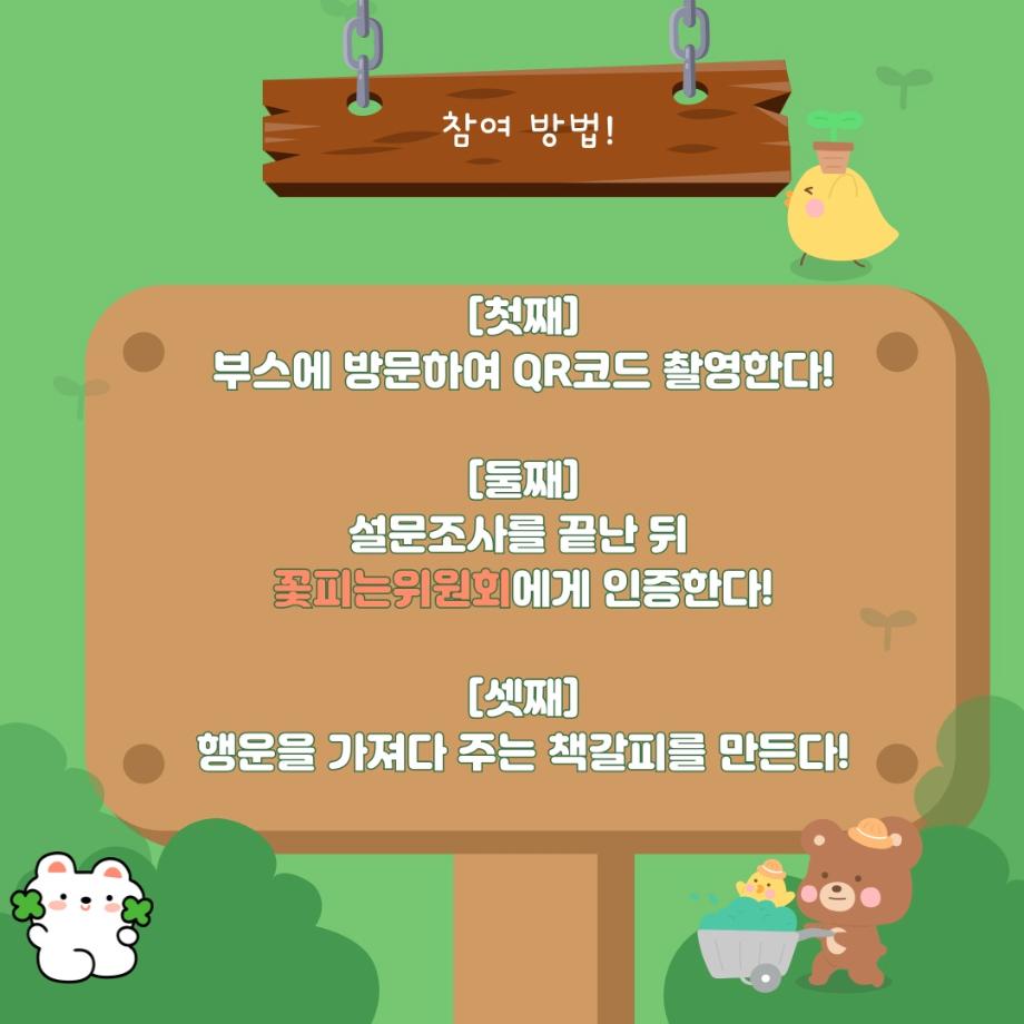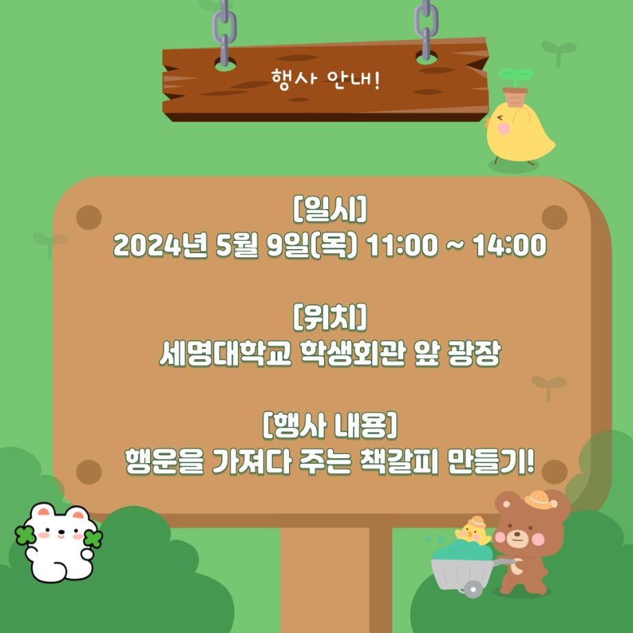 본문 시작 홈으로 공지사항 학생위원회 개요 학생위원회 소개 공지사항 활동결과 홈페이지가이드 프로그램 계획 프로그램 계획 세명대학교 공지사항 프로그램 계획 페이스북 트위터 프린트 [꽃피는 위원회] 행운을 가져다주는 책갈피 만들기 학생처 1758 2024-05-09 행사명 : 행운을 가져다주는 책갈피 만들기 행사일시 : 2024.05.09(목) 11:00시~14시 행사장소 : 학생회관 앞 광장 학생위원회 부스 참여방법 : 꽃피는 위원회 활동 설문조사 완료 인증 후 책갈피 만들기 참여 목록 이전[약속하는 위원회] 약속편지 이전[착한 위원회]제5회 이리오새 페스티벌 담당부서 : 장학복지팀 담당자 : - 연락처 : 043-649-1142 최종수정일 : 2024-10-26 만족도조사 만족도 조사 이 페이지에서 제공하는 정보에 대하여 만족하시나요? 매우만족 만족 보통 불만족 매우불만족