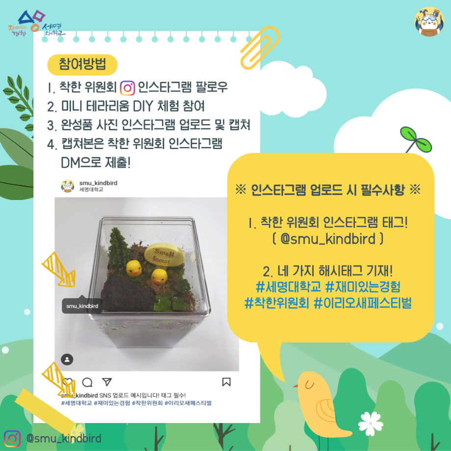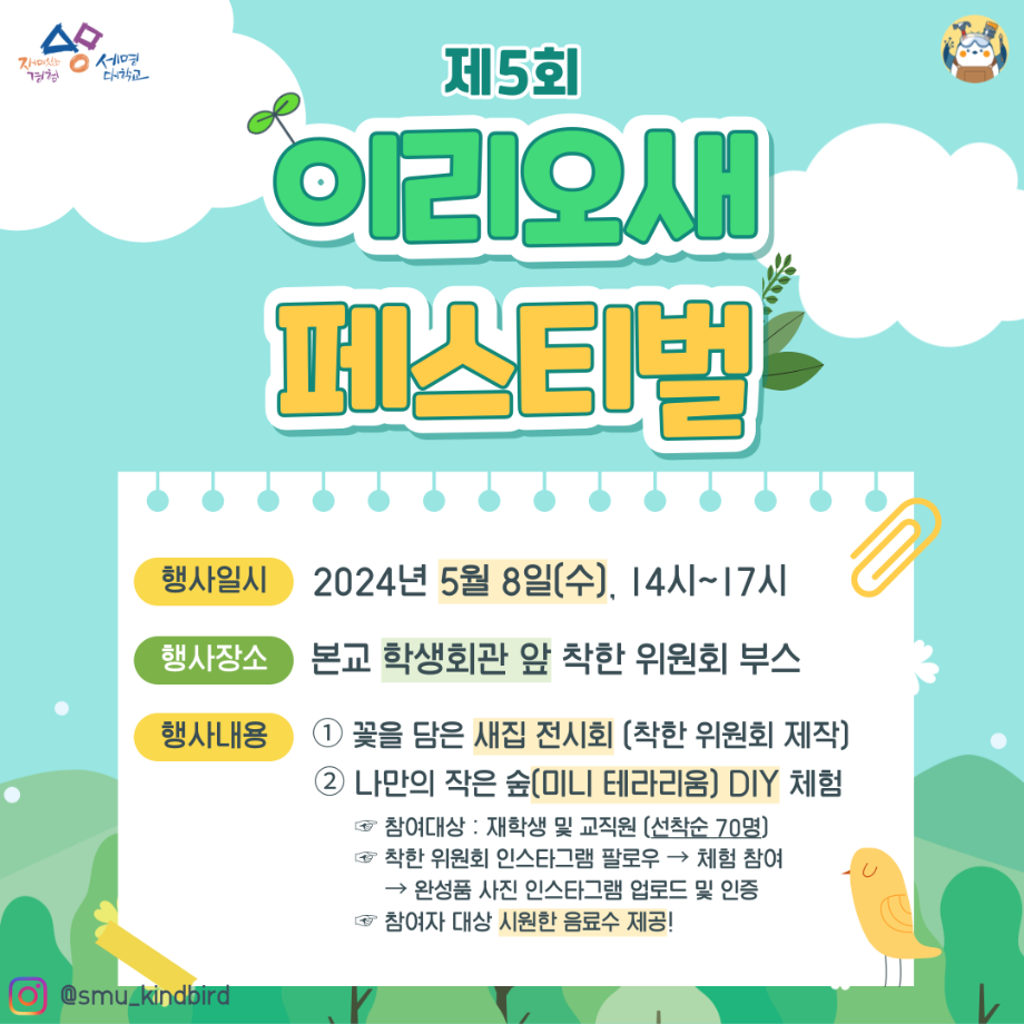본문 시작 홈으로 공지사항 학생위원회 개요 학생위원회 소개 공지사항 활동결과 홈페이지가이드 프로그램 계획 프로그램 계획 세명대학교 공지사항 프로그램 계획 페이스북 트위터 프린트 [착한 위원회]제5회 이리오새 페스티벌 학생처 1889 2024-05-08 [착한 위원회] 제5회 이리오새 페스티벌 1. 행사일시 : 2024년 5월 8일(수), 14시~17시 2. 행사장소 : 본교 학생회관 앞 착한 위원회 부스 3. 행사내용 - 꽃을 담은 새집 전시회 (착한 위원회 제작) - 나만의 작은 숲(미니 테라리움) DIY 체험 (선착순 70명, 참여자 대상 시원한 음료 제공) 목록 다음 [꽃피는 위원회] 행운을 가져다주는 책갈피 만들기 다음 [생각하는 위원회] 하이드 북 담당부서 : 장학복지팀 담당자 : - 연락처 : 043-649-1142 최종수정일 : 2024-10-26 만족도조사 만족도 조사 이 페이지에서 제공하는 정보에 대하여 만족하시나요? 매우만족 만족 보통 불만족 매우불만족