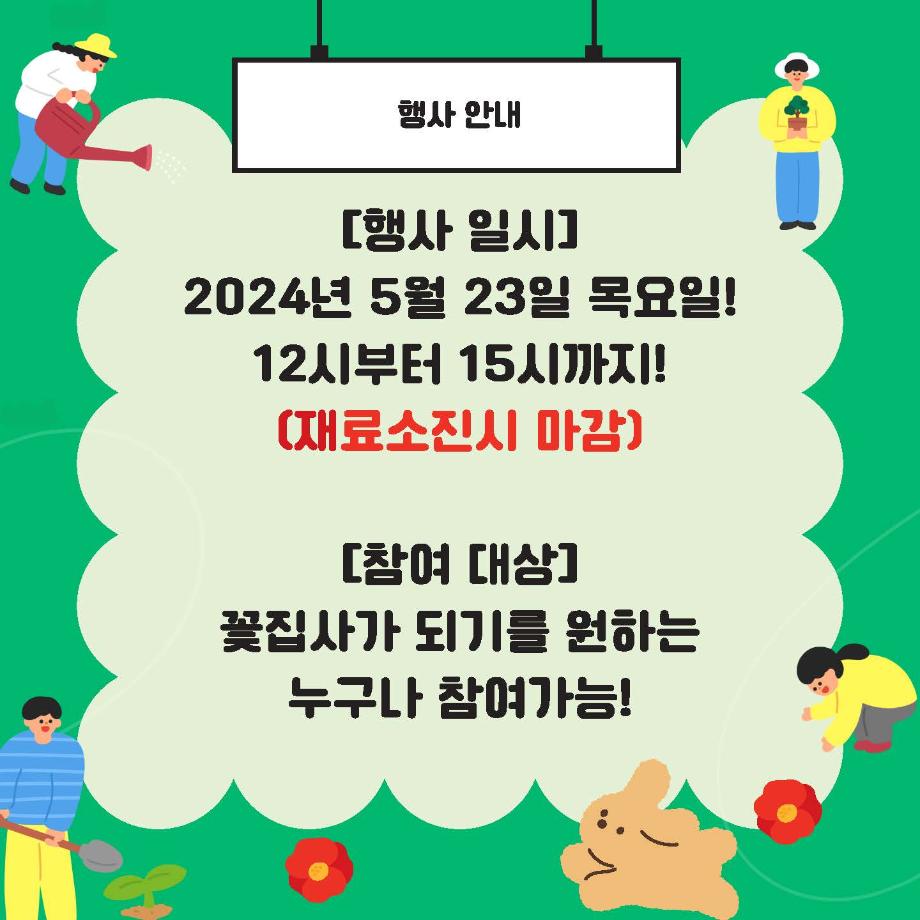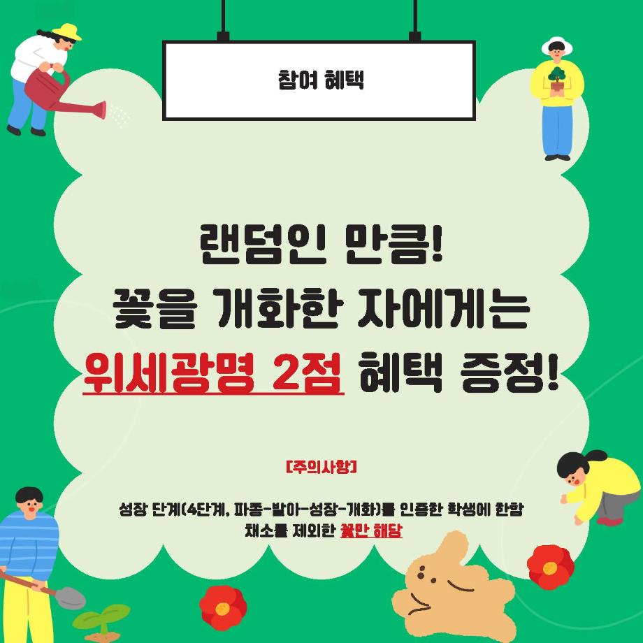 본문 시작 홈으로 공지사항 학생위원회 개요 학생위원회 소개 공지사항 활동결과 홈페이지가이드 프로그램 계획 프로그램 계획 세명대학교 공지사항 프로그램 계획 페이스북 트위터 프린트 [꽃피는 위원회] 제 3회 사랑의 꽃집사 체험이벤트 학생처 1416 2024-05-23 꽃피는 위원회 장기프로젝트 [사랑의 꽃집사 체험이벤트]가 돌어왔습니다. 꽃집사, 식집사가 되고싶은 본교 구성원들의 많은 참여부탁드립니다. 일시 : 2024.05.23(목) 12시~15시 장소 : 학생회관 앞 광장 내 행사부스 참여방법 : 행사부스에 방문하여 복불복 룰렛을 돌려 씨앗을 결정한 후 준비된 재료로 씨앗을 심기 (꽃씨앗에 한해 성장4단계를 인증하는 재학생에게 위세광명포인트 2점 지급) 목록 다음 [생각하는 위원회] 하이드 북 이전[약속하는 위원회] 약속마켓 물품기부자 모집 담당부서 : 장학복지팀 담당자 : - 연락처 : 043-649-1142 최종수정일 : 2024-10-26 만족도조사 만족도 조사 이 페이지에서 제공하는 정보에 대하여 만족하시나요? 매우만족 만족 보통 불만족 매우불만족