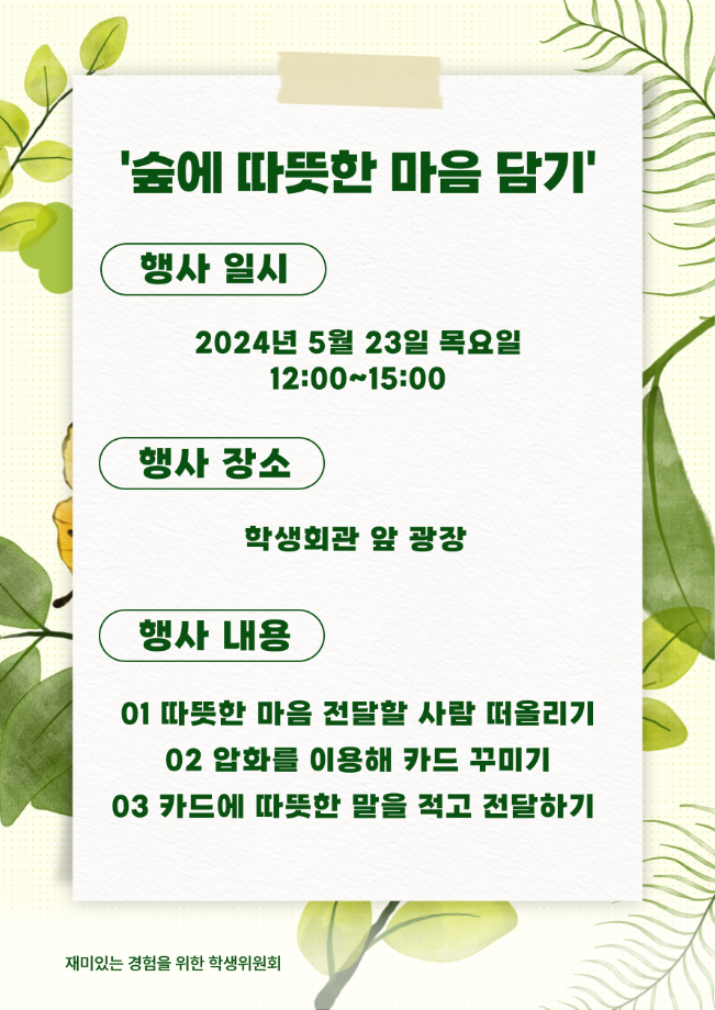 본문 시작 홈으로 공지사항 학생위원회 개요 학생위원회 소개 공지사항 활동결과 홈페이지가이드 프로그램 계획 프로그램 계획 세명대학교 공지사항 프로그램 계획 페이스북 트위터 프린트 [따뜻한 위원회] 숲에 따뜻한 마음 담기 학생처 1398 2024-05-23 [숲에 따뜻한 마음 담기] 일시 : 2024.05.23(목) 장소 : 학생회관 앞 광장 내용 - 따뜻한 마음 전달할 사람 떠올리기 - 압화를 이용한 카드 꾸미기 - 카드에 따뜻한 말 적고 전달하기 목록 이전[맛있는 위원회] 맞그램 틀렸그램 다음 [통하는 위원회] 🔔 MZ 골든벨 개최 🔔 담당부서 : 장학복지팀 담당자 : - 연락처 : 043-649-1142 최종수정일 : 2024-10-26 만족도조사 만족도 조사 이 페이지에서 제공하는 정보에 대하여 만족하시나요? 매우만족 만족 보통 불만족 매우불만족