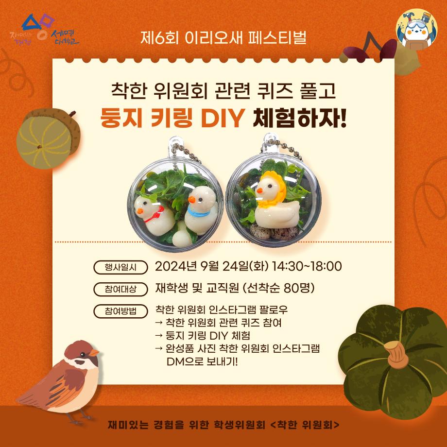 본문 시작 홈으로 공지사항 학생위원회 개요 학생위원회 소개 공지사항 활동결과 홈페이지가이드 프로그램 계획 프로그램 계획 세명대학교 공지사항 프로그램 계획 페이스북 트위터 프린트 [착한 위원회] 제6회 이리오새 페스티벌 학생처 1027 2024-09-19 [착한 위원회] 제6회 이리오새 페스티벌 1. 행사일시 : 2024년 9월 24일(화), 14시 30분~18시 2. 행사장소 : 본교 뭐든지광장 착한 위원회 부스 3. 행사내용 - 착한 위원회 및 체험자 제작 새집 전시회(2022~2024학년도) - 착한 위원회 관련 퀴즈 및 둥지 키링 DIY 체험(선착순 80명, 본교 재학생 및 교직원 대상) 목록 이전[생각하는 위원회] 해먹만족도 조사 다음 [꽃피는 위원회] 비즈반지 만들기 담당부서 : 장학복지팀 담당자 : - 연락처 : 043-649-1142 최종수정일 : 2024-10-26 만족도조사 만족도 조사 이 페이지에서 제공하는 정보에 대하여 만족하시나요? 매우만족 만족 보통 불만족 매우불만족