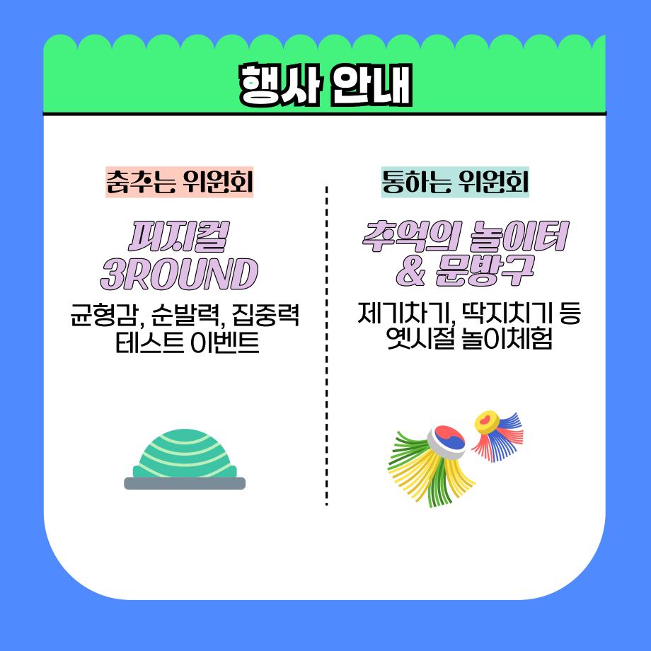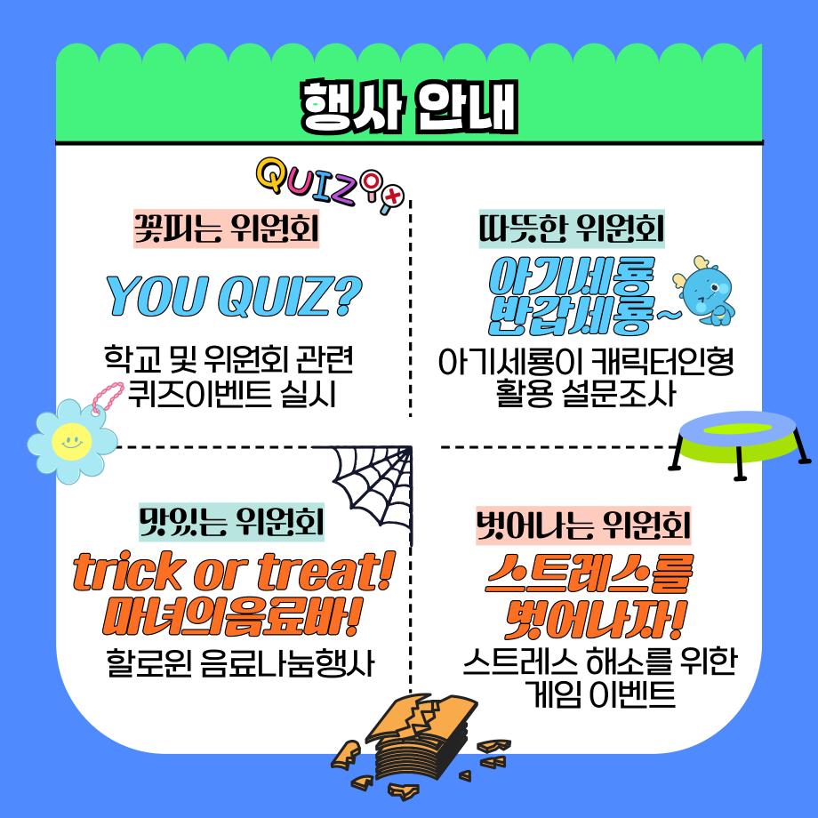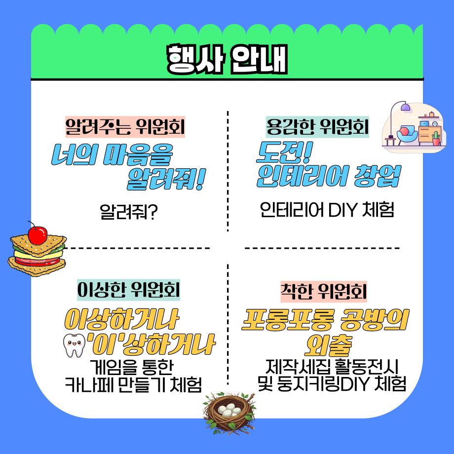 본문 시작 홈으로 공지사항 학생위원회 개요 학생위원회 소개 공지사항 활동결과 홈페이지가이드 프로그램 계획 프로그램 계획 세명대학교 공지사항 프로그램 계획 페이스북 트위터 프린트 학생위원회 연합행사(10개) 학생처 1182 2024-10-30 2024학년도 재미있는 경험을 위한 학생위원회 13개 위원회 중 10개위원회에서 오는 10/30(수)에 아래와 같이 연합행사를 진행합니다. 많은 참여부탁드립니다. 일시 : 2024.10.30(수) 11:30 ~ 14:30 장소 : 학생회관 앞 광장(세명스퀘어) 참여위원회 : 꽃피는 위원회, 따뜻한 위원회, 맛있는 위원회, 벗어나는 위원회, 알려주는 위원회, 용감한 위원회, 이상한 위원회, 착한 위원회, 통하는 위원회, 춤추는 위원회 목록 이전[약속하는 위원회] 무비데이 다음 [알려주는 위원회] 너의 마음을 알려줘 담당부서 : 장학복지팀 담당자 : - 연락처 : 043-649-1142 최종수정일 : 2024-10-26 만족도조사 만족도 조사 이 페이지에서 제공하는 정보에 대하여 만족하시나요? 매우만족 만족 보통 불만족 매우불만족