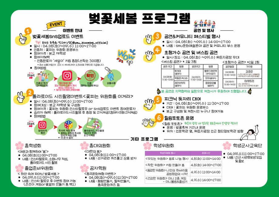 본문 시작 홈으로 공지사항 학생위원회 개요 학생위원회 소개 공지사항 활동결과 홈페이지가이드 프로그램 계획 프로그램 계획 세명대학교 공지사항 프로그램 계획 페이스북 트위터 프린트 [꽃피는 위원회]제4회 세명대학교 벚꽃축제 '벚꽃세봄' 학생처 1057 2025-03-31 [꽃피는 위원회]제4회 세명대학교 벚꽃축제 '벚꽃세봄' 일시 : 2025.04.08(화)~09(수) 11:00~17:00 장소 : 뭐든지광장 일원 내용 : 공연, 이벤트, 체험, 포토존 운영 등 다양한 행사 진행 목록 이전2025학년도 재미있는 경험을 위한 학생위원회 모집 안내 다음 [용감한 위원회]나만의 하바리움, 공방 창업의 시작! 담당부서 : 장학복지팀 담당자 : - 연락처 : 043-649-1142 최종수정일 : 2024-10-26 만족도조사 만족도 조사 이 페이지에서 제공하는 정보에 대하여 만족하시나요? 매우만족 만족 보통 불만족 매우불만족