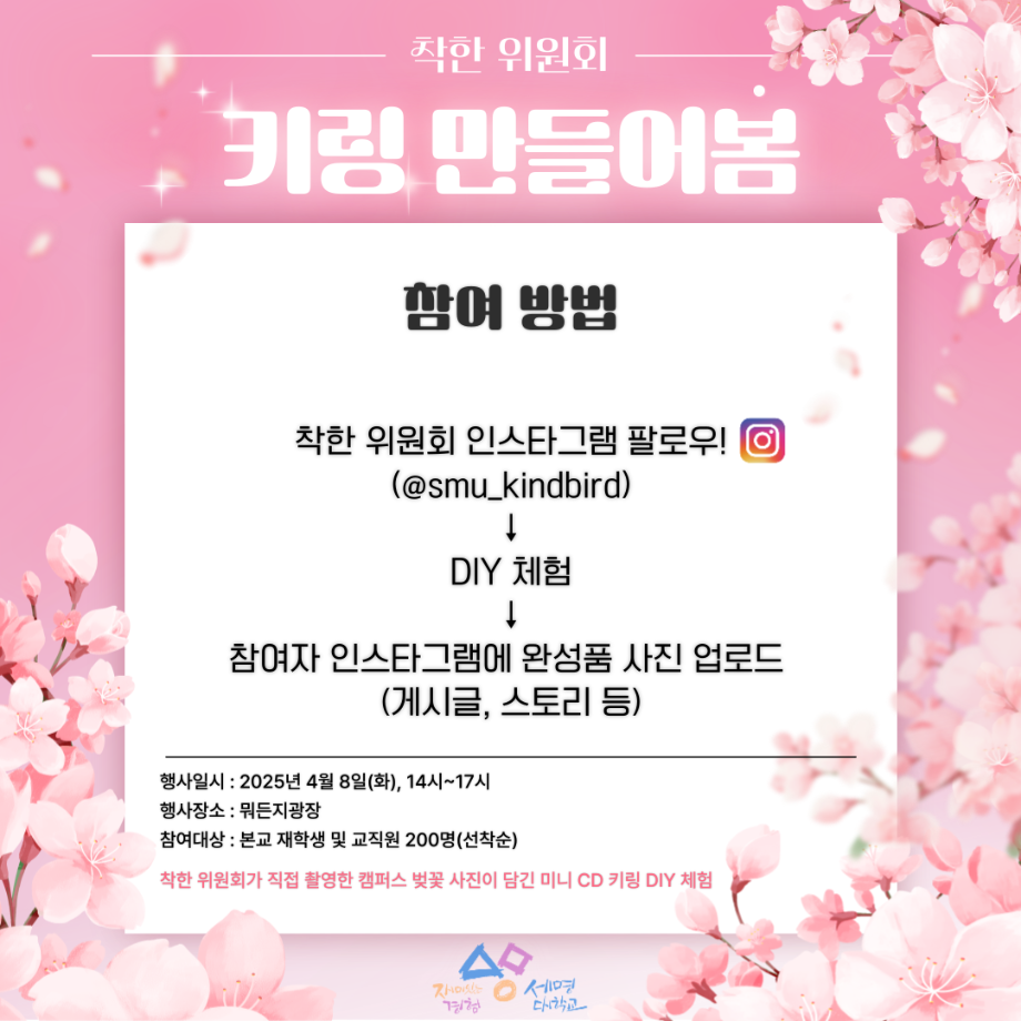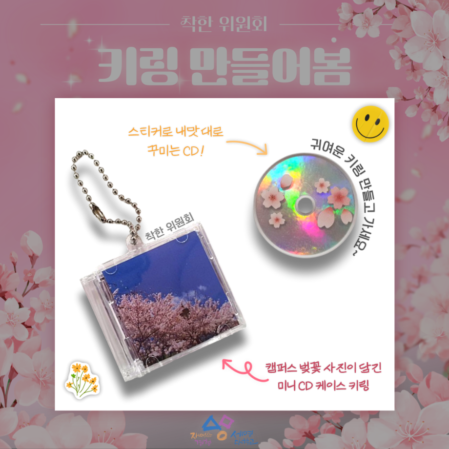 본문 시작 홈으로 공지사항 학생위원회 개요 학생위원회 소개 공지사항 활동결과 홈페이지가이드 프로그램 계획 프로그램 계획 세명대학교 공지사항 프로그램 계획 페이스북 트위터 프린트 [착한 위원회] 키링만들어봄 학생처 907 2025-04-08 [착한 위원회] 키링 만들어봄 1. 행사일시 ■ 2025년 4월 8일(화), 14시~17시 2. 행사장소 ■ 본교 뭐든지광장 3. 행사내용 ■ 착한 위원회가 직접 촬영한 캠퍼스 벚꽃 사진이 담긴 미니 CD 키링 DIY 체험 ■ 본교 재학생 및 교직원 200명 대상(선착순) 목록 이전[맛있는 위원회]맛있나봄 다음 [이상한 위원회]🌸이상한 위원회 벚꽃 포토존 홍보🌸 담당부서 : 장학복지팀 담당자 : - 연락처 : 043-649-1142 최종수정일 : 2024-10-26 만족도조사 만족도 조사 이 페이지에서 제공하는 정보에 대하여 만족하시나요? 매우만족 만족 보통 불만족 매우불만족