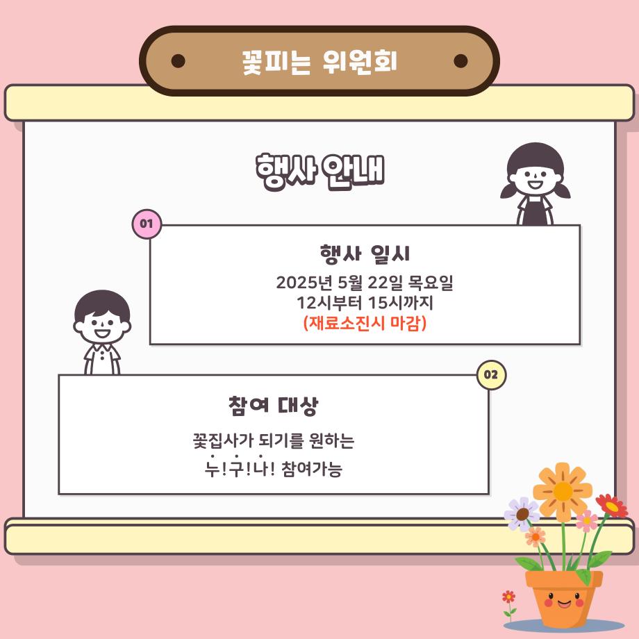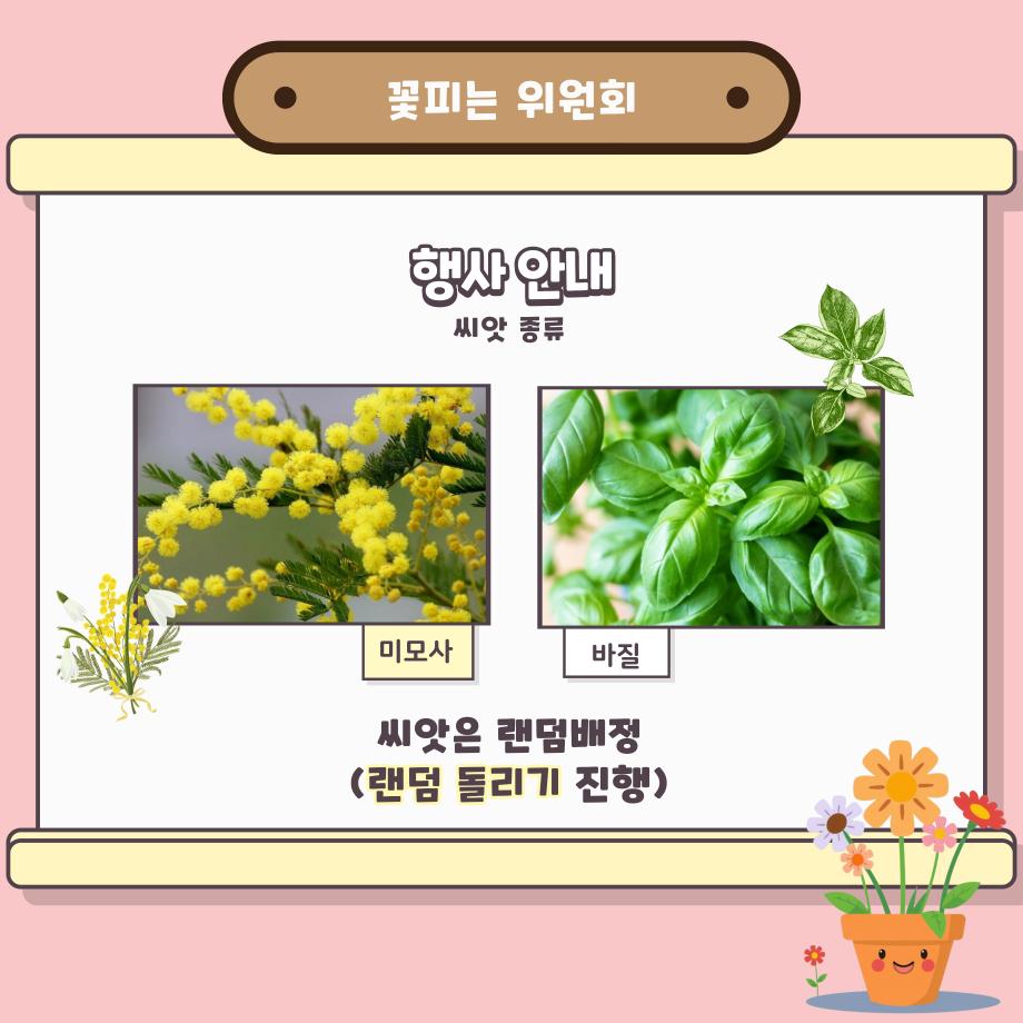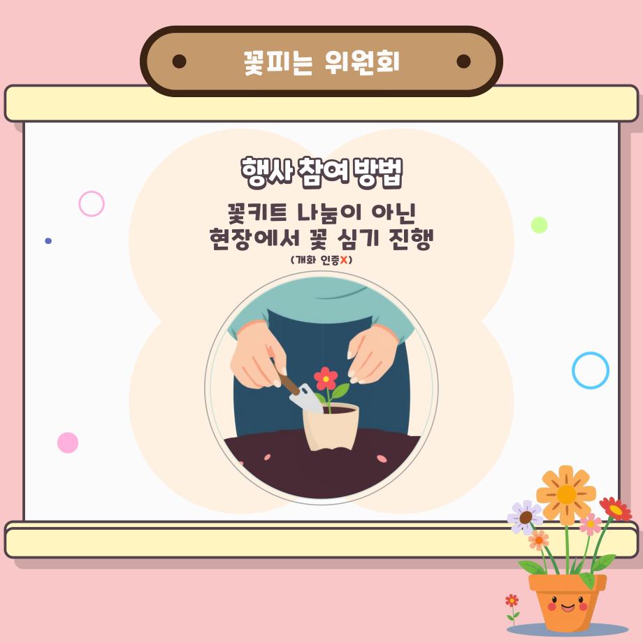 본문 시작 홈으로 공지사항 학생위원회 개요 학생위원회 소개 공지사항 활동결과 홈페이지가이드 프로그램 계획 프로그램 계획 세명대학교 공지사항 프로그램 계획 페이스북 트위터 프린트 [꽃피는 위원회] 제4회 사랑의 꽃집사 이벤트 학생처 1179 2025-05-22 제 4회 사랑의 꽃집사 체험이벤트 1. 일시: 2025.05.22 12시~15시 2. 장소: 학생회관 앞 광장 3. 대상: 본교 구성원 100명 한정 4. 씨앗종류: 미모사, 바질, 버베나 목록 이전[착한 위원회] 포근한 한 송이 이전[약속하는 위원회] 달려라, 에코레이서 담당부서 : 장학복지팀 담당자 : - 연락처 : 043-649-1142 최종수정일 : 2024-10-26 만족도조사 만족도 조사 이 페이지에서 제공하는 정보에 대하여 만족하시나요? 매우만족 만족 보통 불만족 매우불만족