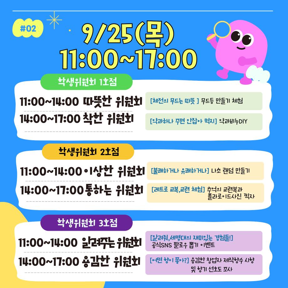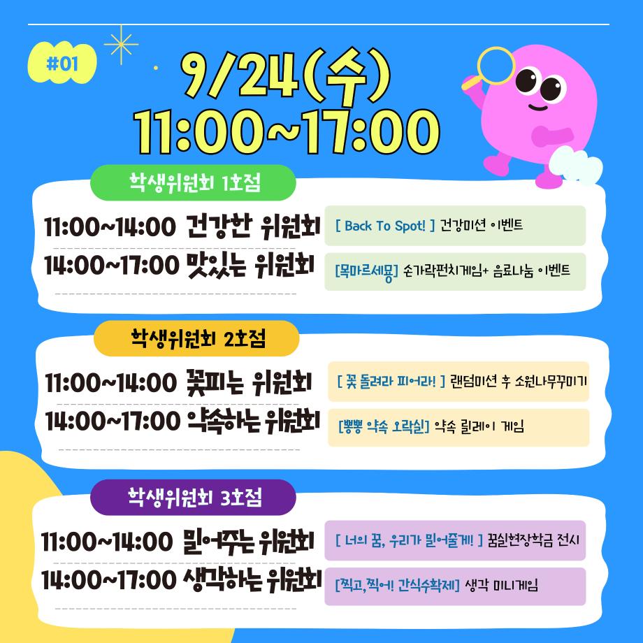 본문 시작 홈으로 공지사항 학생위원회 개요 학생위원회 소개 공지사항 활동결과 홈페이지가이드 프로그램 계획 프로그램 계획 세명대학교 공지사항 프로그램 계획 페이스북 트위터 프린트 [학생위원회] 청룡체전기간 학생위원회 전체활동안내 학생처 286 2025-09-24 청룡체전기간 학생위원회 활동을 아래와 같이 안내드리니 많은 참여 부탁드립니다. 목록 이전[약속하는 위원회]뿅뿅! 약속 오락실! 다음 [꽃피는 위원회] 꽃 돌려라 피어라! 담당부서 : 장학복지팀 담당자 : - 연락처 : 043-649-1142 최종수정일 : 2024-10-26 만족도조사 만족도 조사 이 페이지에서 제공하는 정보에 대하여 만족하시나요? 매우만족 만족 보통 불만족 매우불만족
