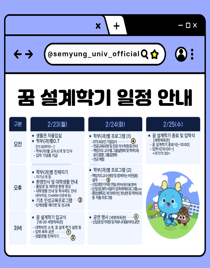 본문 시작 홈으로 커뮤니티 학과소개 교수소개 교육과정 커뮤니티 홈페이지가이드 포토갤러리 학과공지 학사일정 채용정보 및 자료 학생회 포토갤러리 포토갤러리 페이스북 트위터 프린트 2026학년도 신입생 '꿈 설계학기오리엔테이션' 안내 재난안전학과 365 2026-02-13 목록 이전세명대학교 2026학년도 정시모집 안내 다음 2026학년도 신입생 꿈설계학기 동영상 만족도조사 만족도 조사 이 페이지에서 제공하는 정보에 대하여 만족하시나요? 매우만족 만족 보통 불만족 매우불만족