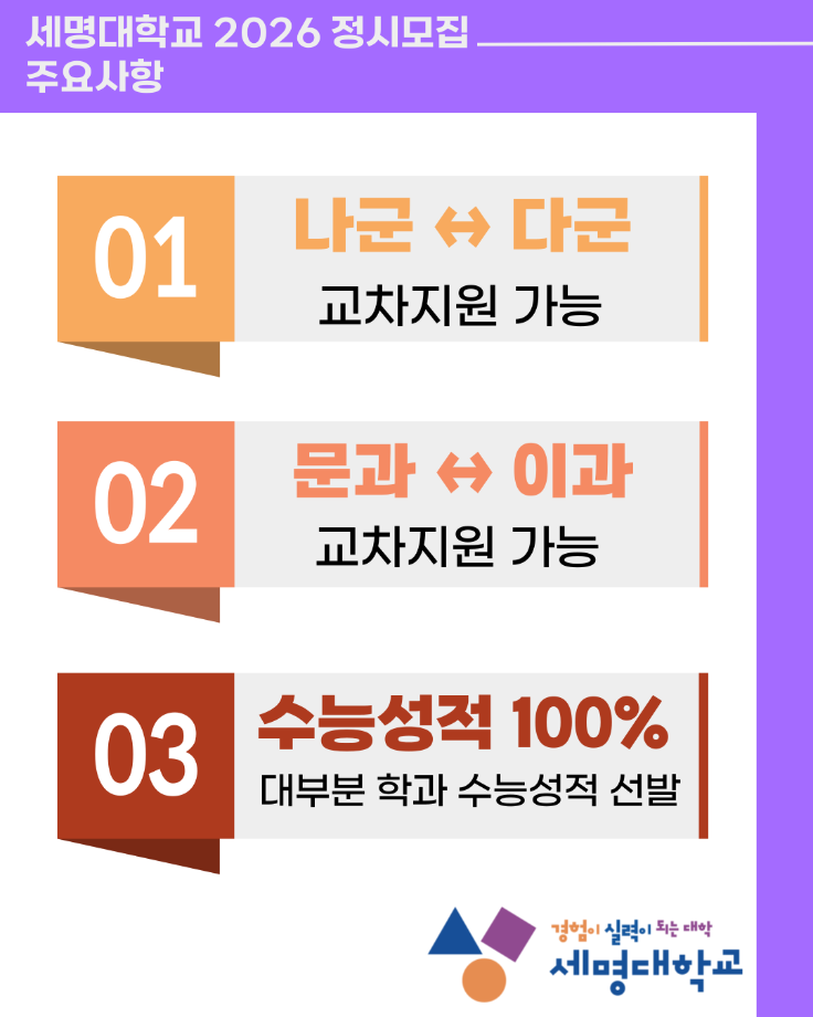 본문 시작 홈으로 커뮤니티 학과소개 교수소개 교육과정 커뮤니티 홈페이지가이드 포토갤러리 학과공지 학사일정 채용정보 및 자료 학생회 포토갤러리 포토갤러리 페이스북 트위터 프린트 세명대학교 2026학년도 정시모집 안내 재난안전학과 854 2025-12-26 목록 이전청룡체전 축구 종목 경기 순간들 다음 2026학년도 신입생 '꿈 설계학기오리엔테이션' 안내 만족도조사 만족도 조사 이 페이지에서 제공하는 정보에 대하여 만족하시나요? 매우만족 만족 보통 불만족 매우불만족