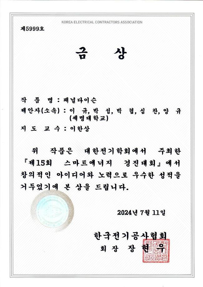 세명대학교 전기공학과 캡스톤디자인팀 ‘121호’, 대한전기학회 하계학술대회 스마트에너지경진대회 ‘금상’ 수상