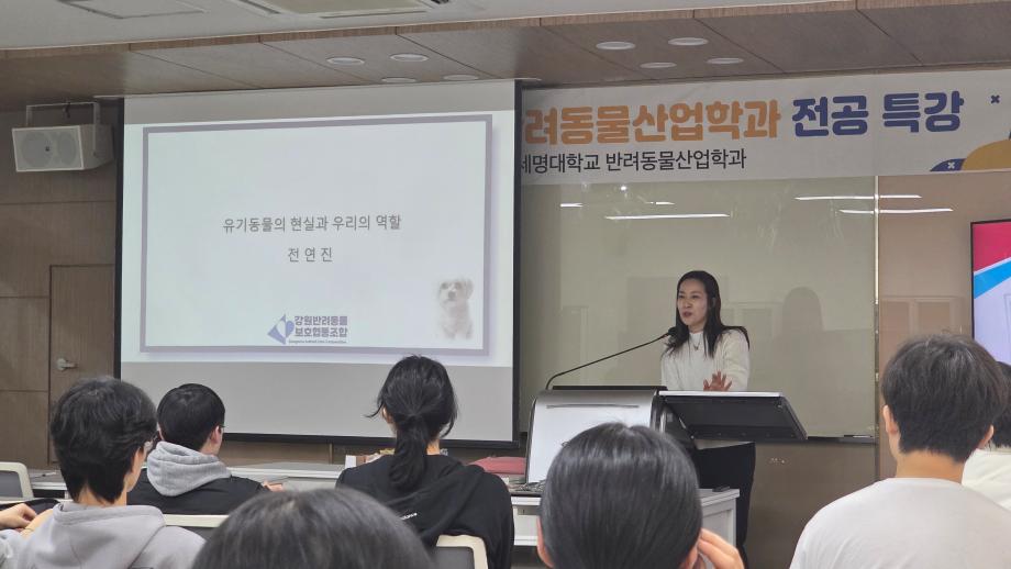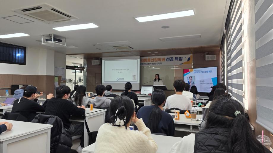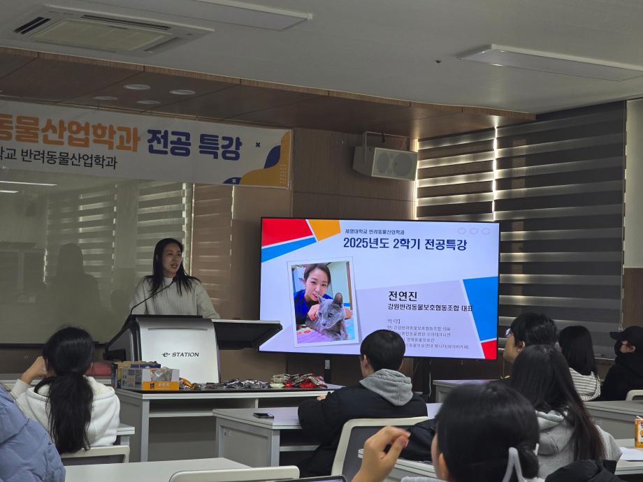 본문 시작 홈으로 커뮤니티 학과소개 교수소개 교육과정 커뮤니티 SNS 홈페이지가이드 학과행사 공지사항 포토갤러리 동아리 학과행사 전공관련정보 학과행사 페이스북 트위터 프린트 2025년도 반려동물산업학과 전공특강 반려동물산업학과 158 2025-12-26 2025년 12월 전연진 강원반려동물보호협호 협동조합 대표님께서 반려동물산업학과 전공특강을 진행해 주셨습니다. 목록 이전이지석 이주형 교수 국립중앙과학원 냥냥이 학술대회 특강 진행 다음 2026학년도 반려동물산업학과 꿈 설계학기 만족도조사 만족도 조사 이 페이지에서 제공하는 정보에 대하여 만족하시나요? 매우만족 만족 보통 불만족 매우불만족