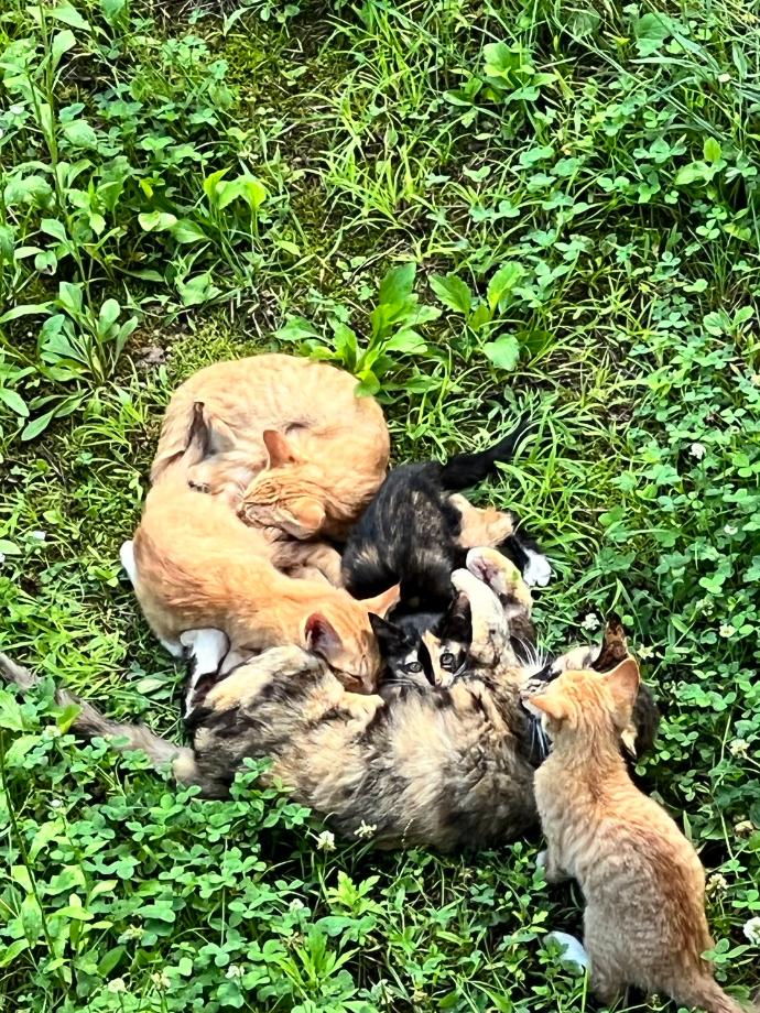 어제 본 모습과, 장마철에 해가 난 날, 제 창가 밑 잔디밭에서 몸을 말리며, 가족끼리 낮잠 자는 모습들입니다. 전에 제 연구실 창으로, 비온 뒤에는 풀밭에서 햋빛에 몸을 말리는 냥이 가족들 모습을 촬영한 사진과, 저녁에 느긋이 쉬는 모습입니다.