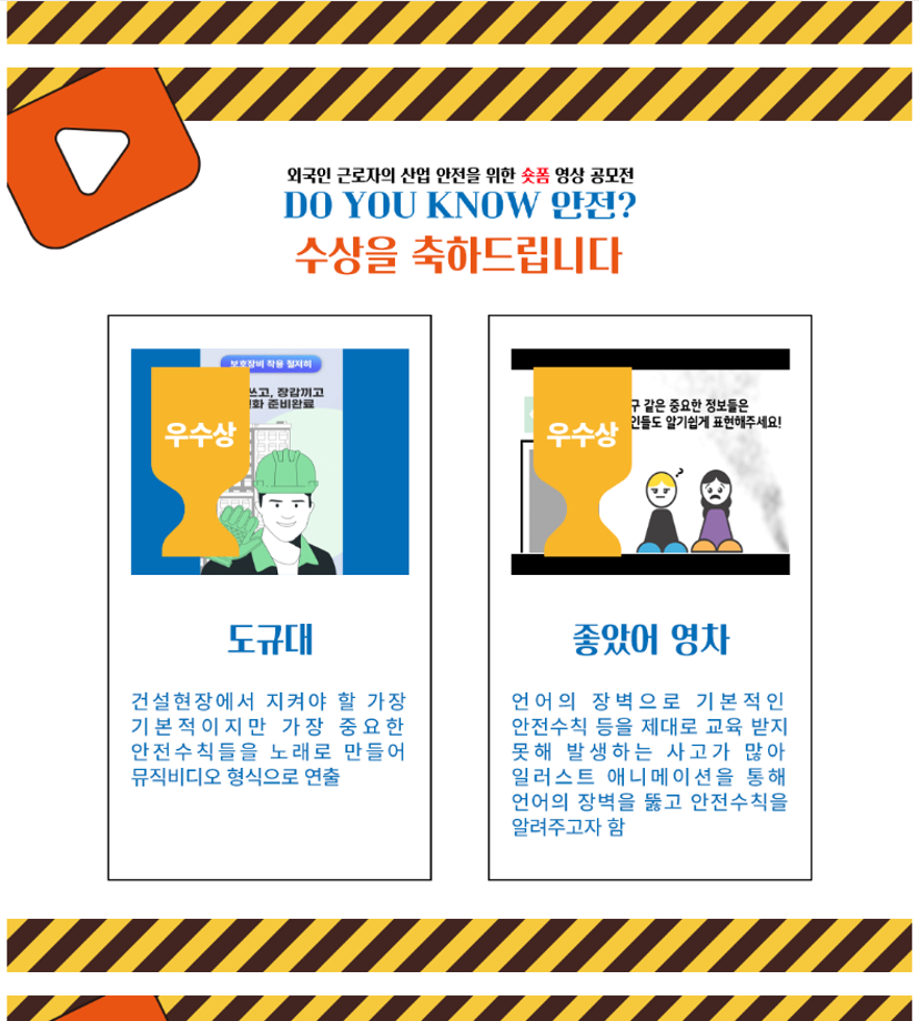 본문 시작 홈으로 학과자랑 학과소개 학과과정 시영소식 입학/취업 AI 학과자랑 SNS소통 홈페이지가이드 학과자랑 학과자랑 갤러리 공모전 동아리 졸업전시회 학과자랑 페이스북 트위터 프린트 외국인 근로자를 위한 숏폼 영상 공모전 - DO YOU KNOW 안전? 시각영상디자인학과 1800 2024-09-08 2학년 심*호/방*림팀(좋았어 영차)이 우수상을 수상하엿습니다~ 축하합니다~ 외국인 근로자의 산업안전을 위한 숏폼 영상 공모전 (safetycon.kr) [본선진출후보작] 꼭 알아둬요! 산업 안전 수칙! (youtube.com) 목록 이전2024학년도 1학기 총장표창 (시각영상디자인학과 3명 수상) 다음 졸업생 인터뷰 - 20학번 졸업생 이*현 담당부서 : 시각영상디자인학과 담당자 : - 연락처 : 043-649-1726 최종수정일 : 2024-10-26 만족도조사 만족도 조사 이 페이지에서 제공하는 정보에 대하여 만족하시나요? 매우만족 만족 보통 불만족 매우불만족