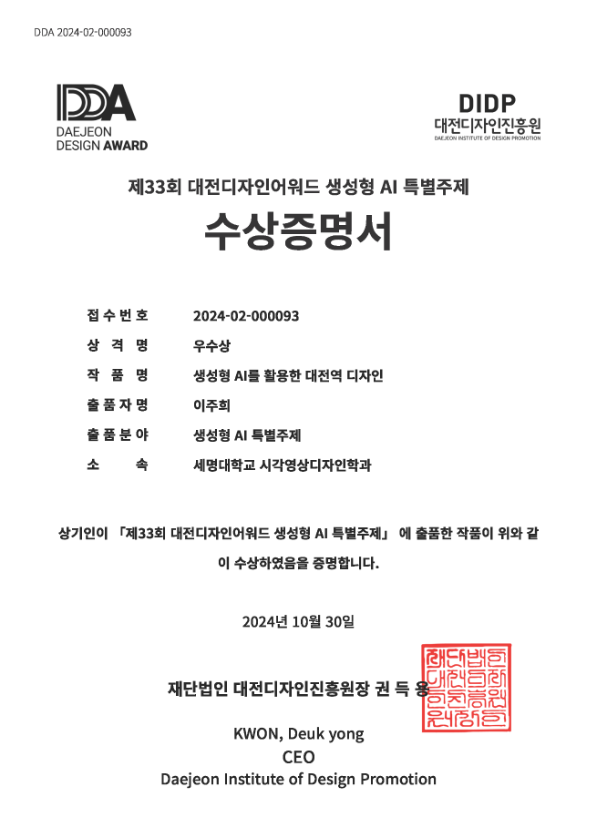 본문 시작 홈으로 학과자랑 학과소개 학과과정 시영소식 입학/취업 AI 학과자랑 SNS소통 홈페이지가이드 학과자랑 학과자랑 갤러리 공모전 동아리 졸업전시회 학과자랑 페이스북 트위터 프린트 제33회 대전디자인어워드-우수상 시각영상디자인학과 1653 2024-11-02 제33회 대전디자인어워드의 생성형 AI 특별주제부분에서 우수상(생성형 AI를 활용한 대전역 디자인-이*희학생)을 수상하였습니다 이밖에 고*호, 윤*환, 조*니학생이 특선 수상하엿습니다 목록 이전졸업생 인터뷰 - 20학번 졸업생 이*현 다음 시장 서비스러닝 / 벽화 서비스러닝 담당부서 : 시각영상디자인학과 담당자 : - 연락처 : 043-649-1726 최종수정일 : 2024-10-26 만족도조사 만족도 조사 이 페이지에서 제공하는 정보에 대하여 만족하시나요? 매우만족 만족 보통 불만족 매우불만족