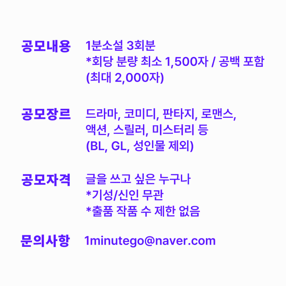 -공모내용: 1분소설 3회분 *회당 분량 최소 1,500자 / 공백 포함 (최대 2,000자)