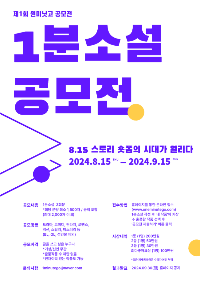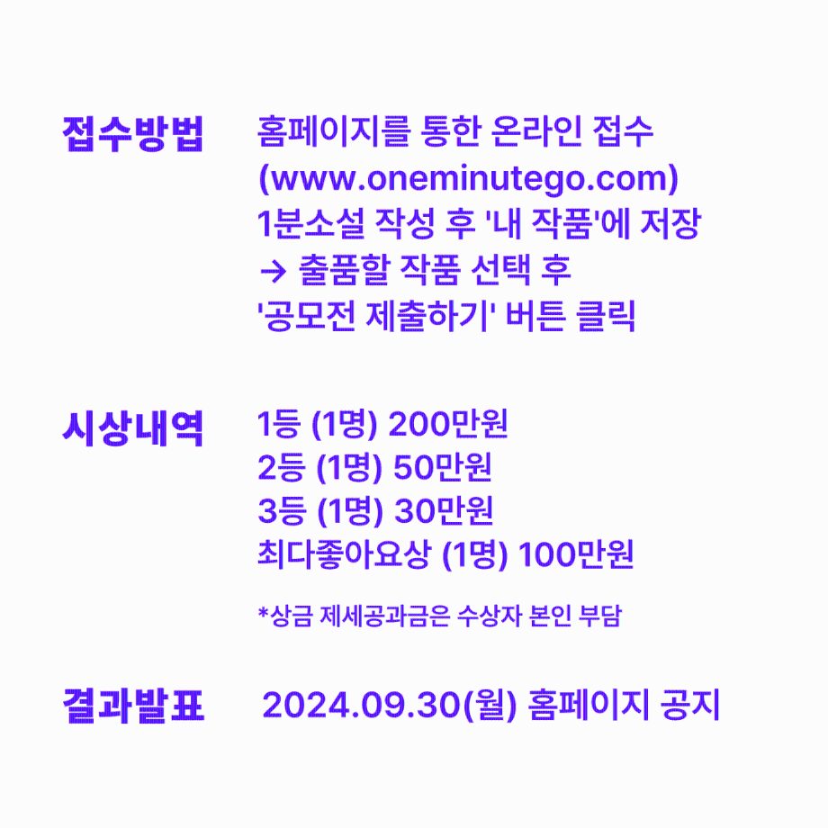 -접수방법: 홈페이지를 통한 온라인 접수(https://oneminutego.com/home) 1분소설 작성 후 '내 작품'에 저장 -> 출품할 작품 선택 후 '공모전 제출하기' 버튼 클릭