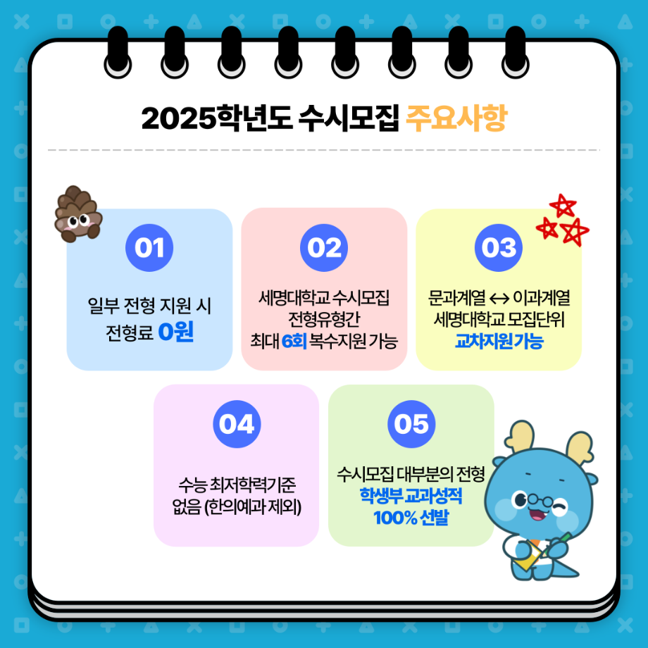 본문 시작 홈으로 MCC News 학과소개 교수소개 학과과정 MCC News MCC SNS 홈페이지가이드 미디어 정보통 학과 및 재학생 교수 및 졸업생 미디어 정보통 미디어 정보통 페이스북 트위터 프린트 📌 세명대학교 2025학년도 수시모집 주요사항 안내 📌 디지털콘텐츠창작학과 1770 2024-08-20 📌 세명대학교 2025학년도 수시모집 주요사항 안내 📌 예비 세명인들 주목~!!🔥 수시모집 주요사항부터 9월, 10월, 11월 일정까지! ✨세명대학교 2025학년도 수시모집 주요사항✨을 안내합니다👏 9월 9일부터 13일! 수시 원서 접수하고 💙재미있는 경험 가득한 세명대💙에서 만나요! 목록 이전2024학년도 2학기 한국장학재단 학자금대출 신청 안내 이전📌재학생맞춤형고용서비스 미래내일일경험 기업탐방캠프 신청 안내🎯 담당부서 : 미디어콘텐츠창작학과 담당자 : - 연락처 : 043-649-1741 최종수정일 : 2024-10-26 만족도조사 만족도 조사 이 페이지에서 제공하는 정보에 대하여 만족하시나요? 매우만족 만족 보통 불만족 매우불만족