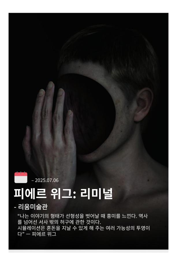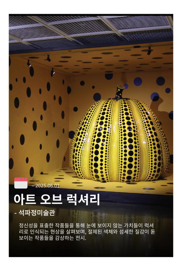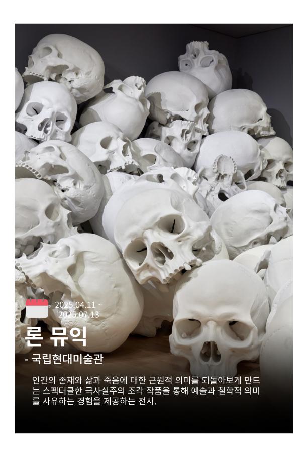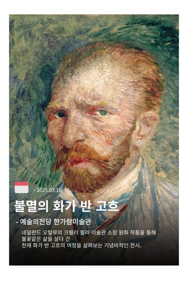본문 시작 홈으로 MCC News 학과소개 교수소개 학과과정 MCC News MCC SNS 홈페이지가이드 미디어 정보통 학과 및 재학생 교수 및 졸업생 미디어 정보통 미디어 정보통 페이스북 트위터 프린트 우리과 학생이라면 한 번 가볼만한 전시회 추천!🫠 미디어콘텐츠창작학과 2179 2025-03-11 새학기도 시작한 기념으로 전시회도 한 번 갔다와보는건 어떨까요?🎨 1.불멸의 화가 반 고흐 2.피에르 위그:리미널 3.론 뮤익 4.아트 오브 럭셔리 5.인상파, 모네에서 미국으로 6.워너 브롱크호스트 추가적인 정보들은 학과 인스타그램을 참고해주세요! @SMU_MCC 목록 이전📚2025 광화문글판 대학생 에세이 공모전 (교보생명)✒ 다음 2025학년도 제천시장학금 신청 및 제천시 신규 전입 안내 담당부서 : 미디어콘텐츠창작학과 담당자 : - 연락처 : 043-649-1741 최종수정일 : 2024-10-26 만족도조사 만족도 조사 이 페이지에서 제공하는 정보에 대하여 만족하시나요? 매우만족 만족 보통 불만족 매우불만족