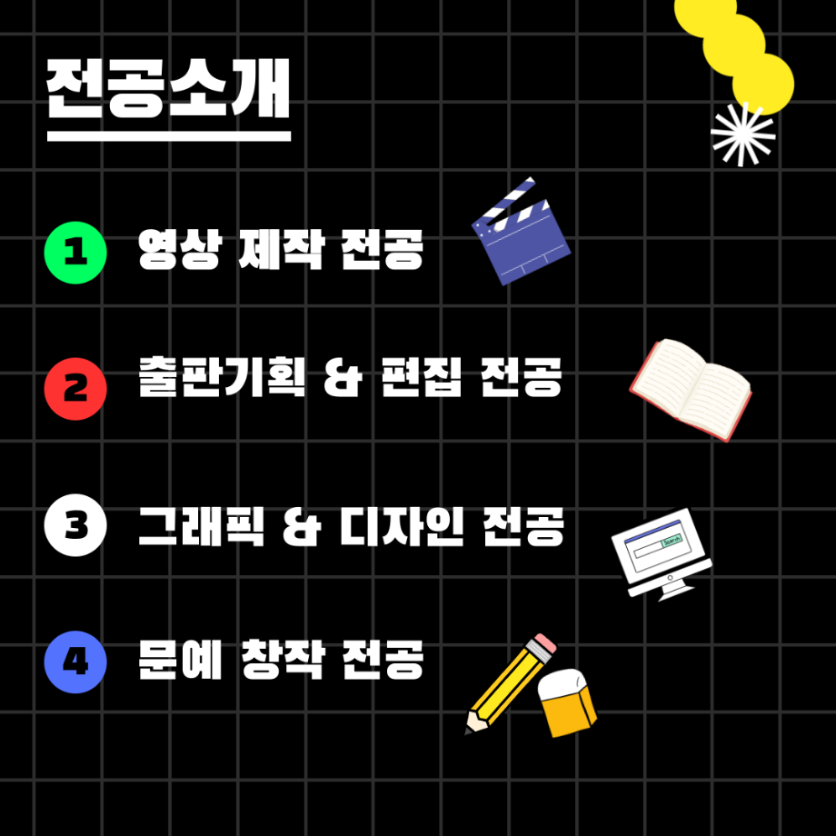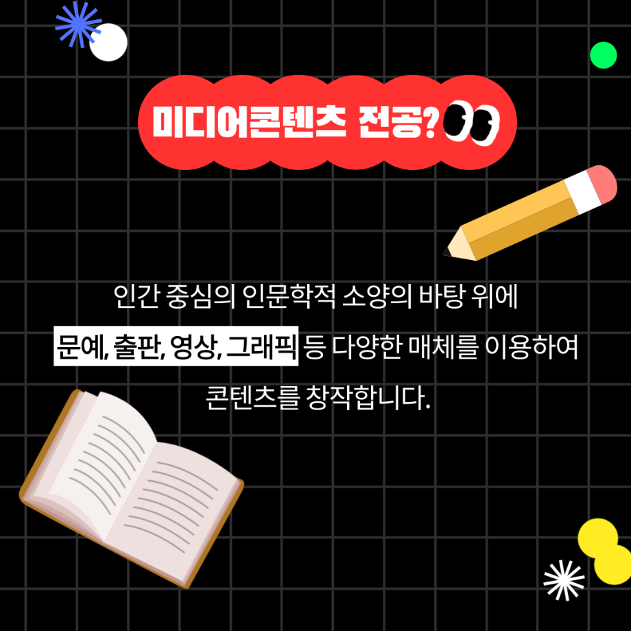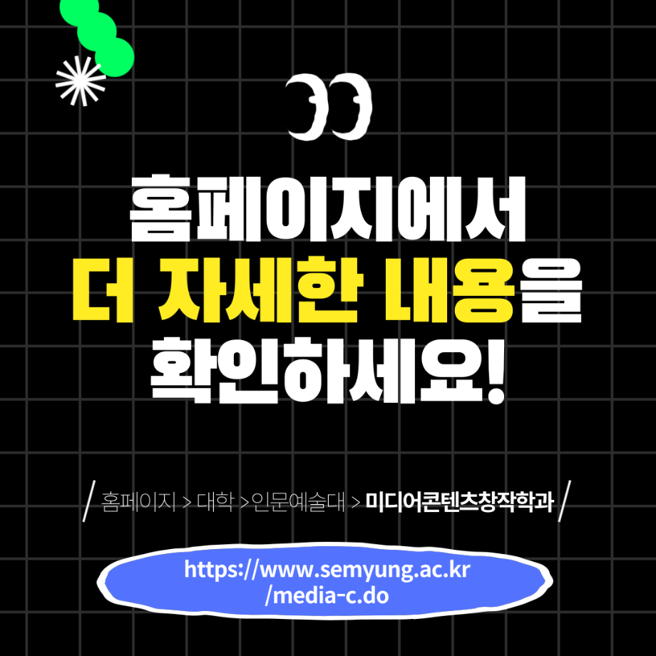본문 시작 홈으로 MCC News 학과소개 교수소개 학과과정 MCC News MCC SNS 홈페이지가이드 미디어 정보통 학과 및 재학생 교수 및 졸업생 미디어 정보통 미디어 정보통 페이스북 트위터 프린트 미디어콘텐츠창작학과 궁금해?! 미디어콘텐츠창작학과 1120 2025-07-21 🎥미디어콘텐츠창작학과❗️궁금해❓📖 영상부터 출판, 그래픽, 소설까지! 내 아이디어를 콘텐츠로 만드는 곳. 창작의 모든 과정을 직접 경험하고, 나만의 이야기를 세상에 전하세요✨ 자세한 내용은 미콘창 인스타그램에서 확인하세요 @smu_mcc 목록 이전여름방학 갈만한 여행지 추천.zip 다음 2025 시청자미디어대상 방송영상공모전 담당부서 : 미디어콘텐츠창작학과 담당자 : - 연락처 : 043-649-1741 최종수정일 : 2024-10-26 만족도조사 만족도 조사 이 페이지에서 제공하는 정보에 대하여 만족하시나요? 매우만족 만족 보통 불만족 매우불만족