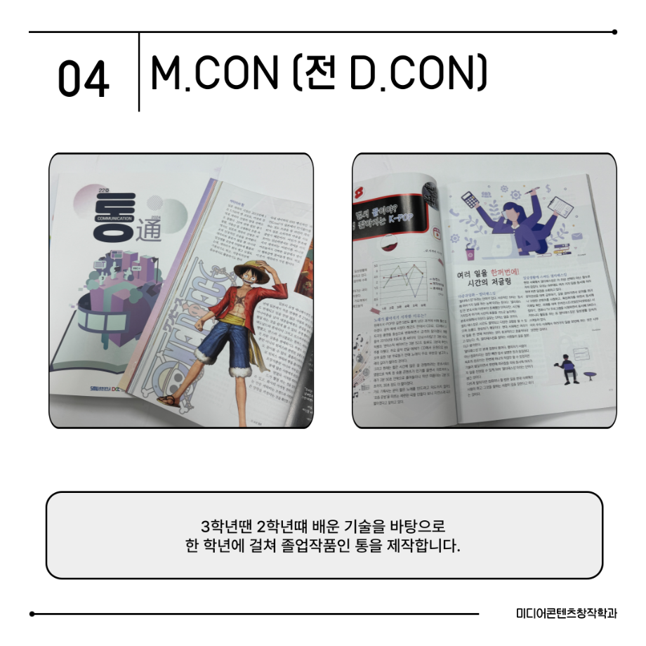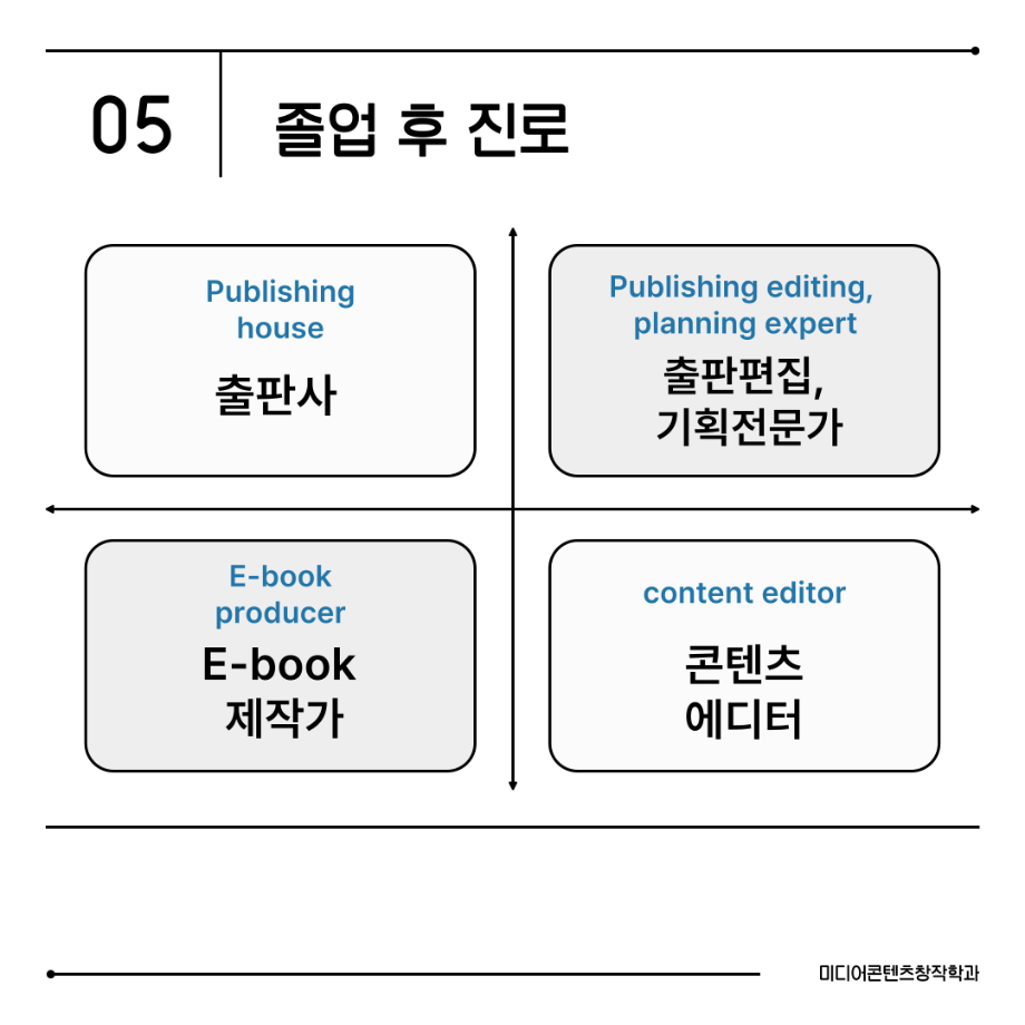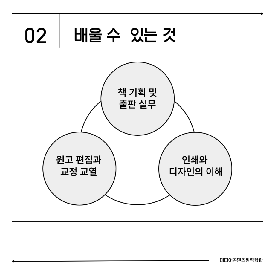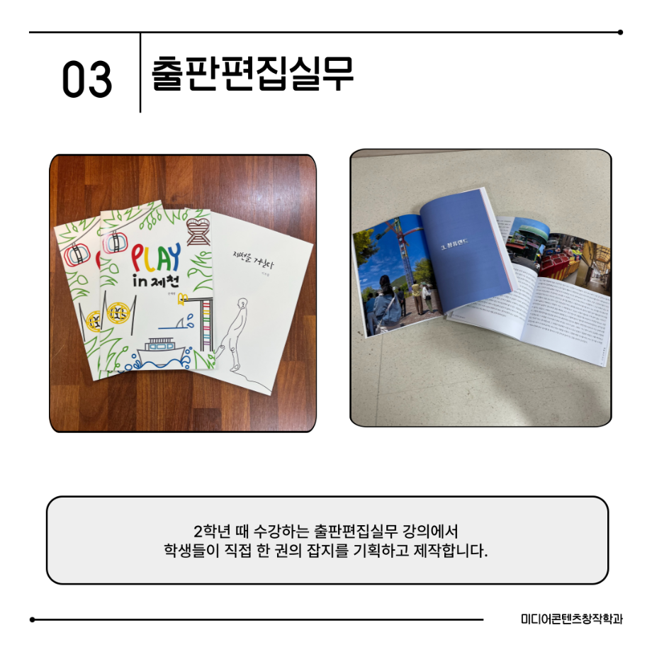 본문 시작 홈으로 MCC News 학과소개 교수소개 학과과정 MCC News MCC SNS 홈페이지가이드 미디어 정보통 학과 및 재학생 교수 및 졸업생 미디어 정보통 미디어 정보통 페이스북 트위터 프린트 📖미디어콘텐츠창작학과 | 출판 전공 미디어콘텐츠창작학과 1009 2025-08-19 출판 전공에서는 원고 편집, 기획, 디자인까지 책 제작의 모든 과정을 직접 경험합니다. 한 권의 책이 나오기까지는 수많은 손길이 필요합니다. 출판 전공은 글을 다듬고, 디자인하고, 기획하며 세상에 새로운 이야기를 전하는 과정을 배우는 곳입니다. 목록 이전경험이 실력이 되는 세명대학교 다음 📖 미디어콘텐츠창작학과 | 소설 전공 담당부서 : 미디어콘텐츠창작학과 담당자 : - 연락처 : 043-649-1741 최종수정일 : 2024-10-26 만족도조사 만족도 조사 이 페이지에서 제공하는 정보에 대하여 만족하시나요? 매우만족 만족 보통 불만족 매우불만족
