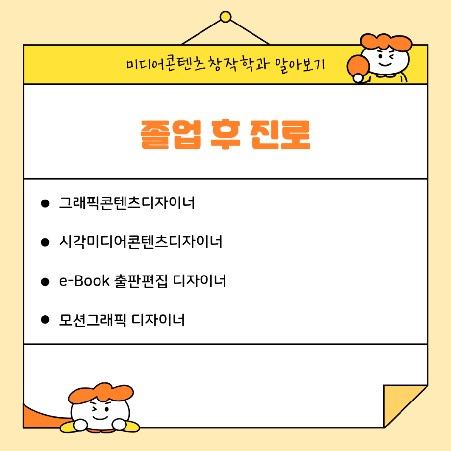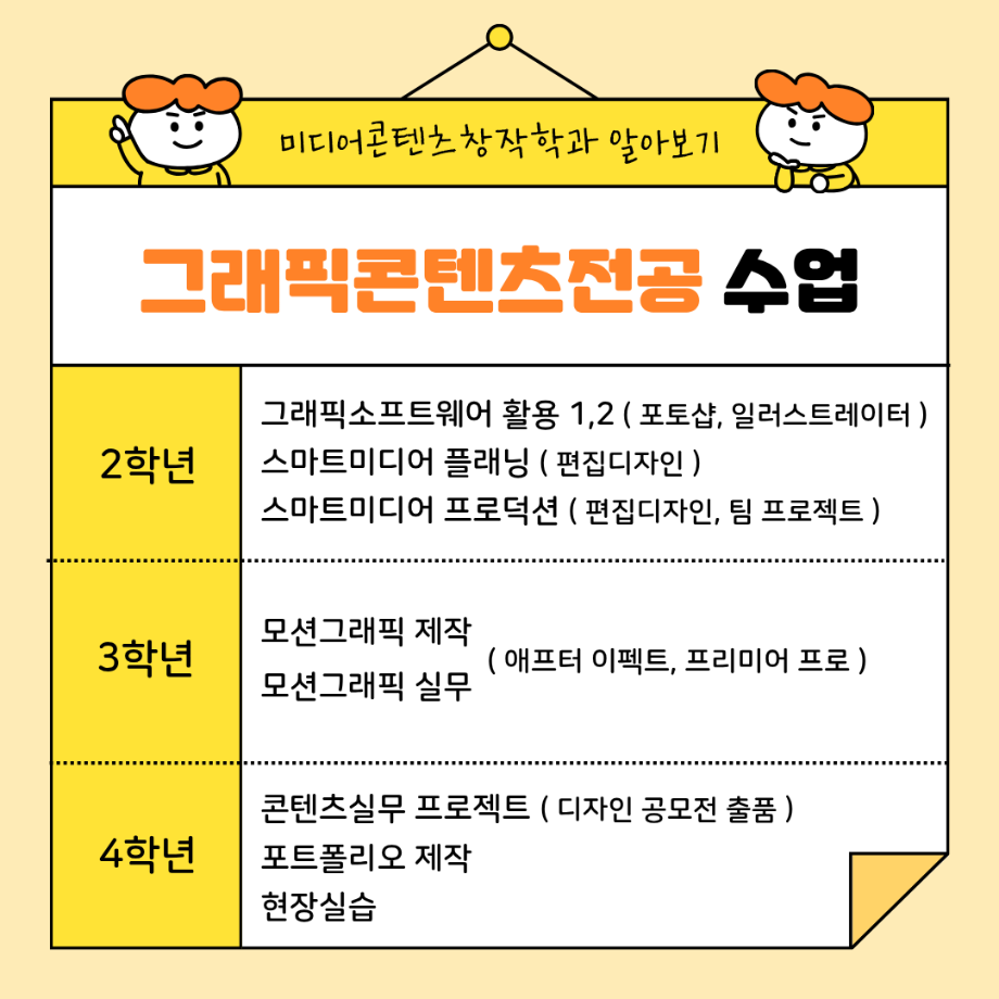 본문 시작 홈으로 MCC News 학과소개 교수소개 학과과정 MCC News MCC SNS 홈페이지가이드 미디어 정보통 학과 및 재학생 교수 및 졸업생 미디어 정보통 미디어 정보통 페이스북 트위터 프린트 🎨 미디어콘텐츠창작학과 | 그래픽 전공 미디어콘텐츠창작학과 1086 2025-09-10 그래픽 전공에서는 디자인의 기초부터 디지털 콘텐츠 제작까지 실무에 필요한 다양한 시각 표현 기술을 배웁니다. 학생들은 직접 작업물을 만들며 디자이너, 영상 그래픽 전문가, 콘텐츠 크리에이터로 성장할 수 있습니다. 목록 이전백억커피 x 곰믹스 AI 활용 영상 공모전 다음 2025학년도 2학기 원어민 교수와의 대화 담당부서 : 미디어콘텐츠창작학과 담당자 : - 연락처 : 043-649-1741 최종수정일 : 2024-10-26 만족도조사 만족도 조사 이 페이지에서 제공하는 정보에 대하여 만족하시나요? 매우만족 만족 보통 불만족 매우불만족