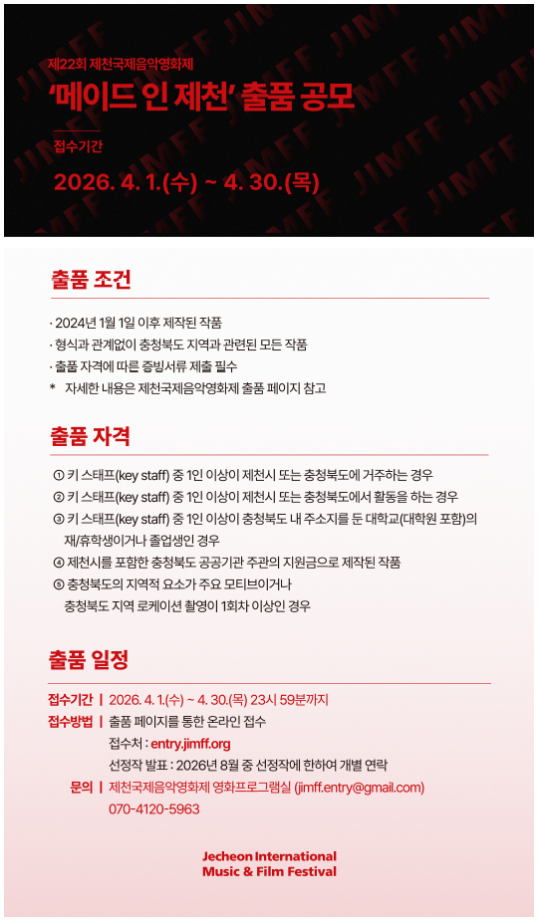 본문 시작 홈으로 학과소식 학과소개 교육과정 학과소식 학과작품 학과SNS 서울대학로 민송아트홀 홈페이지가이드 공모전 공지사항 학과뉴스 공모전 동아리 포토갤러리 공모전 페이스북 트위터 프린트 '메이드 인 제천' 출품 공모 영화웹툰애니메이션학과 8 2026-04-06 목록 이전충북 대학생 문화·관광 홍보영상 제작 공모전 만족도조사 만족도 조사 이 페이지에서 제공하는 정보에 대하여 만족하시나요? 매우만족 만족 보통 불만족 매우불만족