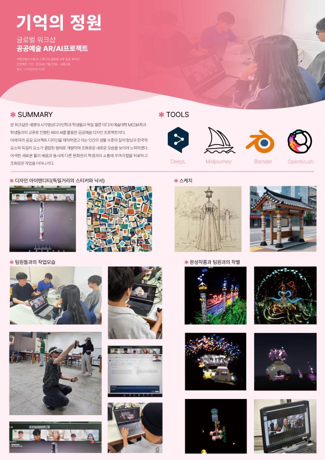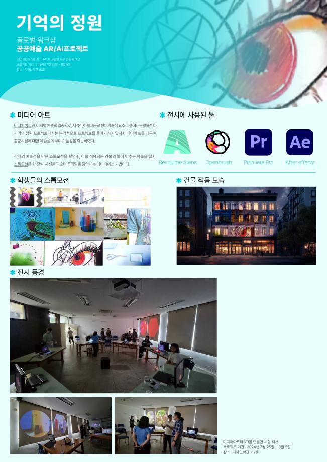 본문 시작 홈으로 AI 학과소개 학과과정 시영소식 입학/취업 AI 학과자랑 SNS소통 홈페이지가이드 AI 콘텐츠 연구소(AI 디자인) 디자인 정보 AI 콘텐츠 연구소(AI 디자인) AI 콘텐츠 연구소(AI 디자인) 페이스북 트위터 프린트 세명 AI 콘텐츠 연구소 - 세명 콘텐츠스쿨(SMCS) 가을 정기 전시회 시각영상디자인학과 783 2025-03-17 2024.12.4~12.13에 진행된 세명 콘텐츠스쿨(SMCS) 가을 정기 전시회에서 글로벌 워크샵 - 공공예술 AR/AI 프로젝트와 생성 AI 디자인 & 생성 AI 영상으로 세명 AI 콘텐츠 연구소가 참여, 전시하였습니다. 목록 이전세명 AI 콘텐츠 연구소 - 성과발표회 참여 다음 세명 AI 콘텐츠 연구소 - AI art & Design 만족도조사 만족도 조사 이 페이지에서 제공하는 정보에 대하여 만족하시나요? 매우만족 만족 보통 불만족 매우불만족