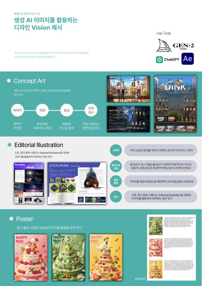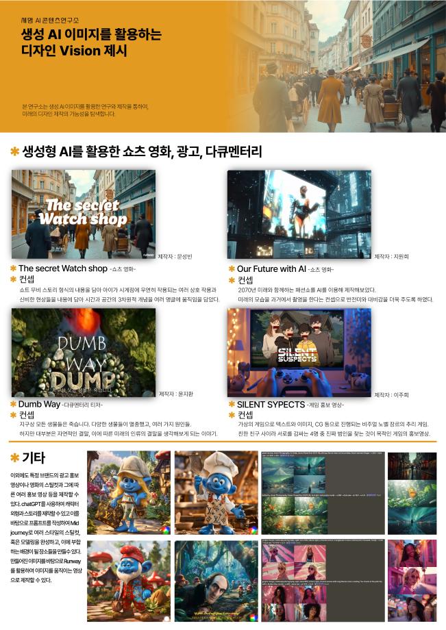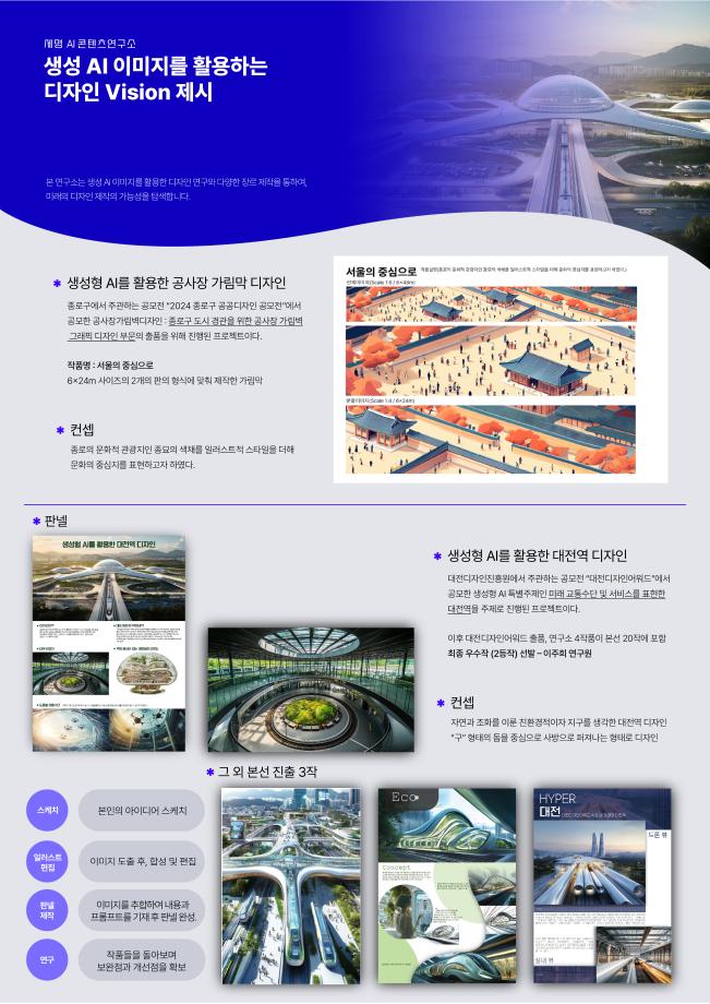 본문 시작 홈으로 AI 학과소개 학과과정 시영소식 입학/취업 AI 학과자랑 SNS소통 홈페이지가이드 AI 콘텐츠 연구소(AI 디자인) 디자인 정보 AI 콘텐츠 연구소(AI 디자인) AI 콘텐츠 연구소(AI 디자인) 페이스북 트위터 프린트 세명 AI 콘텐츠 연구소 - AI art & Design 시각영상디자인학과 824 2025-03-17 세명 AI 콘텐츠 연구소 소속 연구원들이 AI art & Design 전시회를 위해 만든 작업물입니다. 목록 이전세명 AI 콘텐츠 연구소 - 세명 콘텐츠스쿨(SMCS) 가을 정기 전시회 다음 세명 AI 콘텐츠 연구소 - AI art & Design 전시회 만족도조사 만족도 조사 이 페이지에서 제공하는 정보에 대하여 만족하시나요? 매우만족 만족 보통 불만족 매우불만족