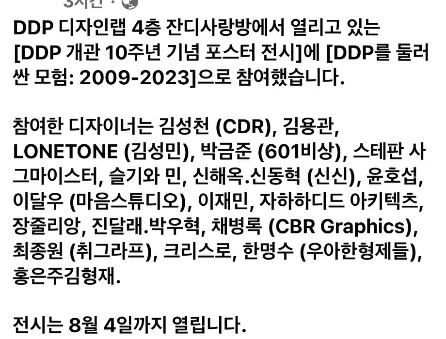 본문 시작 홈으로 AI 학과소개 학과과정 시영소식 입학/취업 AI 학과자랑 SNS소통 홈페이지가이드 디자인 정보 디자인 정보 AI 콘텐츠 연구소(AI 디자인) 디자인 정보 페이스북 트위터 프린트 <DDP 개관 10주년 기념 포스터> 전시 시각영상디자인학과 1754 2024-06-13 <DDP 개관 10주년 기념 포스터> 전시 일정 2024-04-26 ~ 2024-08-04 ※연중무휴 장소 동대문디자인플라자(DDP) 디자인랩 4층 잔디사랑방, 뮤지엄 B2~1F 디자인둘레길 시간 10:00-20:00 관람비용 무료 https://ddp.or.kr/index.html?menuno=230&siteno=2&bbsno=518&boardno=15&bbstopno=518&act=view&subno= 목록 이전디스트릭트 창립20주년 기념 첫번째 아트프로젝트 다음 《미래긍정: 노먼 포스터, 포스터 + 파트너스》 만족도조사 만족도 조사 이 페이지에서 제공하는 정보에 대하여 만족하시나요? 매우만족 만족 보통 불만족 매우불만족