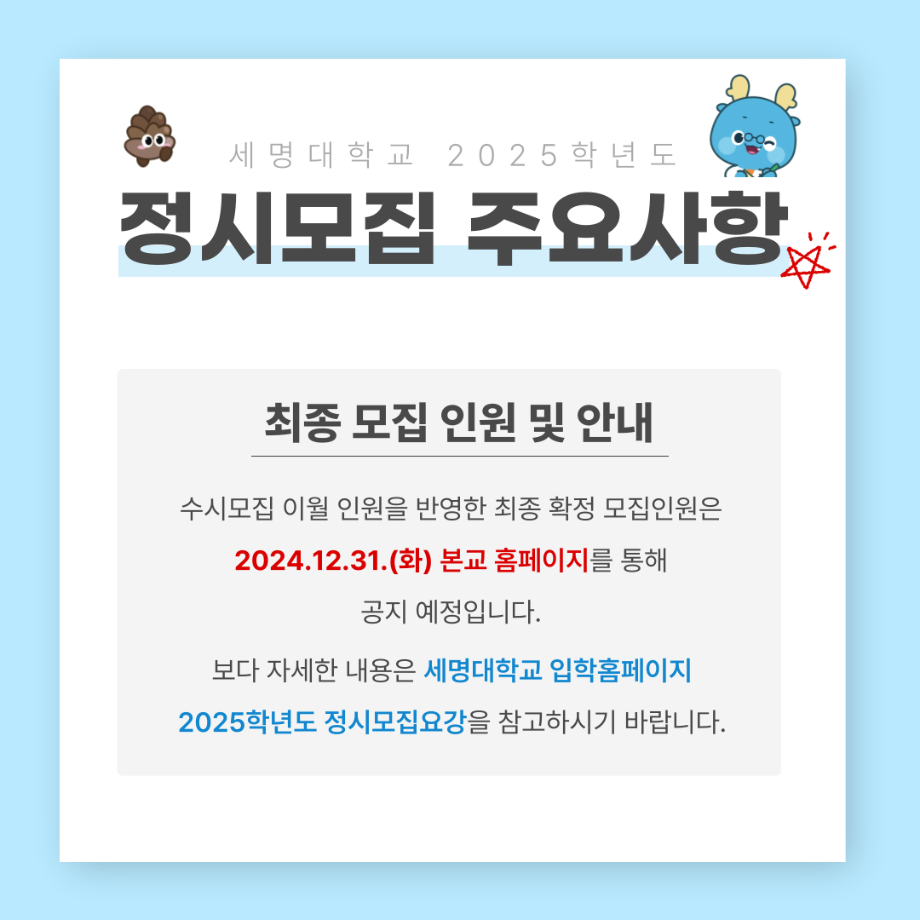 본문 시작 홈으로 입학/취업 학과소개 학과과정 시영소식 입학/취업 AI 학과자랑 SNS소통 홈페이지가이드 입학여기 입학여기 취업지금 전공소개 입학여기 페이스북 트위터 프린트 2025학년도 정시모집 주요사항 시각영상디자인학과 2858 2024-12-31 2025학년도 정시모집 주요사항 카드뉴스입니다. 원서접수(유웨이어플라이)- 2024. 12. 31(화) 09:00~2025. 1. 3(금) 23:00 ->시각영상디자인학과 수능 100% 선발 목록 이전2025학년도 정시모집요강 다음 2025 신입생 추가 모집 안내 만족도조사 만족도 조사 이 페이지에서 제공하는 정보에 대하여 만족하시나요? 매우만족 만족 보통 불만족 매우불만족