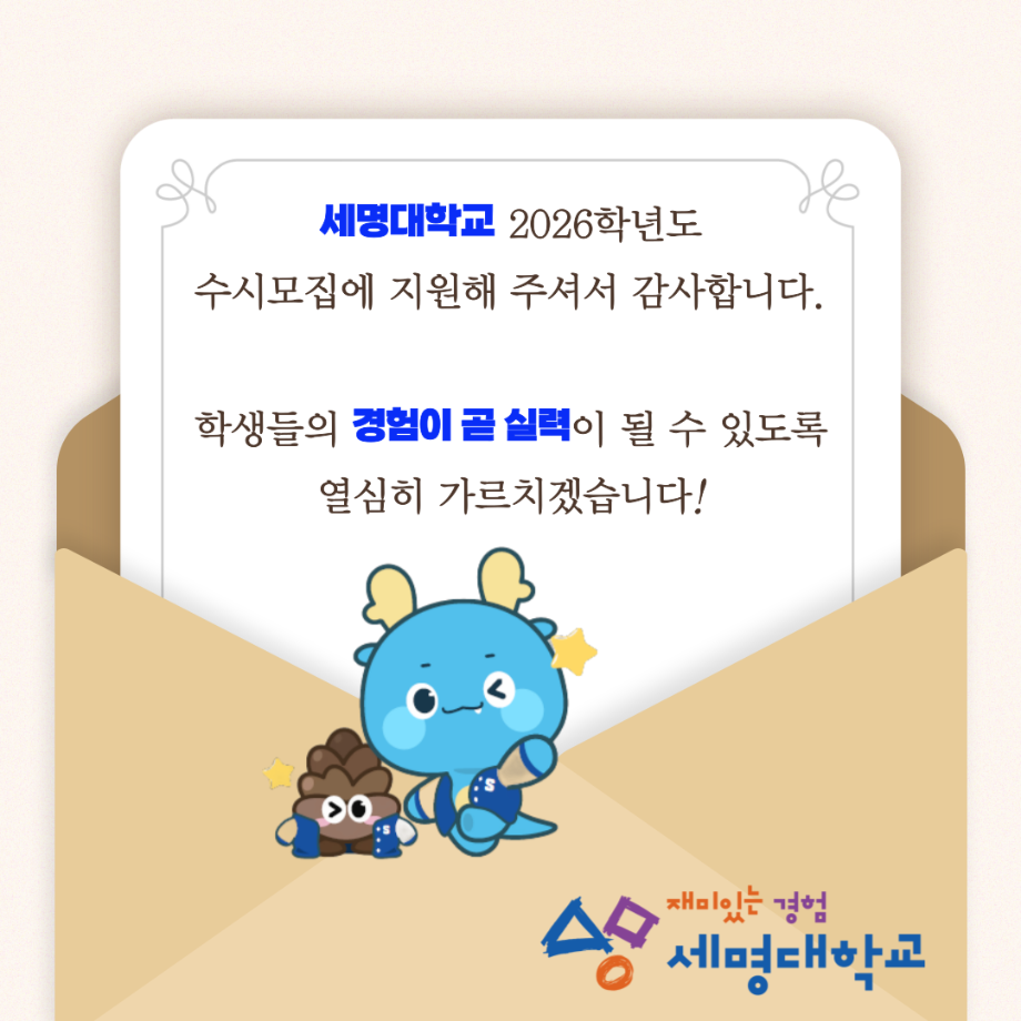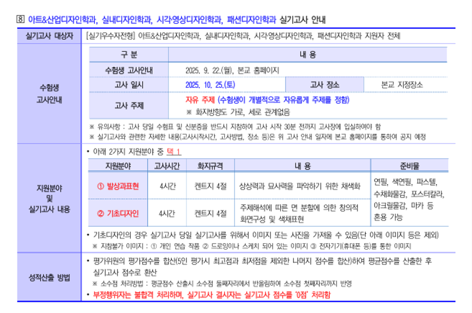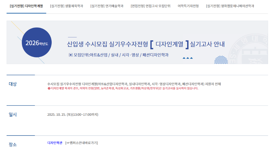 본문 시작 홈으로 입학/취업 학과소개 학과과정 시영소식 입학/취업 AI 학과자랑 SNS소통 홈페이지가이드 입학여기 입학여기 취업지금 전공소개 입학여기 페이스북 트위터 프린트 2026 수시모집 디자인계열학과 실기고사 안내 - 시각영상디자인학과 시각영상디자인학과 930 2025-10-01 2026 수시모집 디자인계열학과 실기고사 안내- 시각영상디자인학과 실기고사 안내 바로가기 > https://www.semyung.ac.kr/ipsi/sub01_07_03.do 목록 이전8월 12일 -중고등학생 대상 취업 특강- AI 브랜딩 다음 세명대학교_2026학년도 정시모집요강 만족도조사 만족도 조사 이 페이지에서 제공하는 정보에 대하여 만족하시나요? 매우만족 만족 보통 불만족 매우불만족
