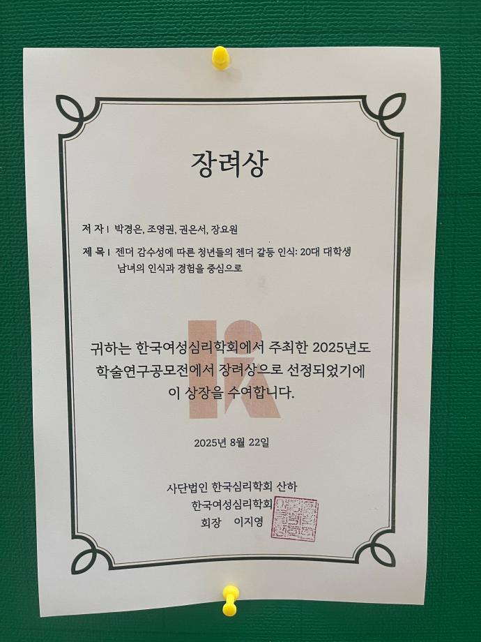 한국여성심리학회 주최 2025년도 학술연구공모전 장려상 수상