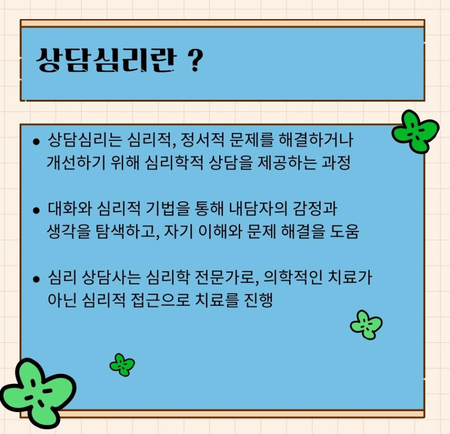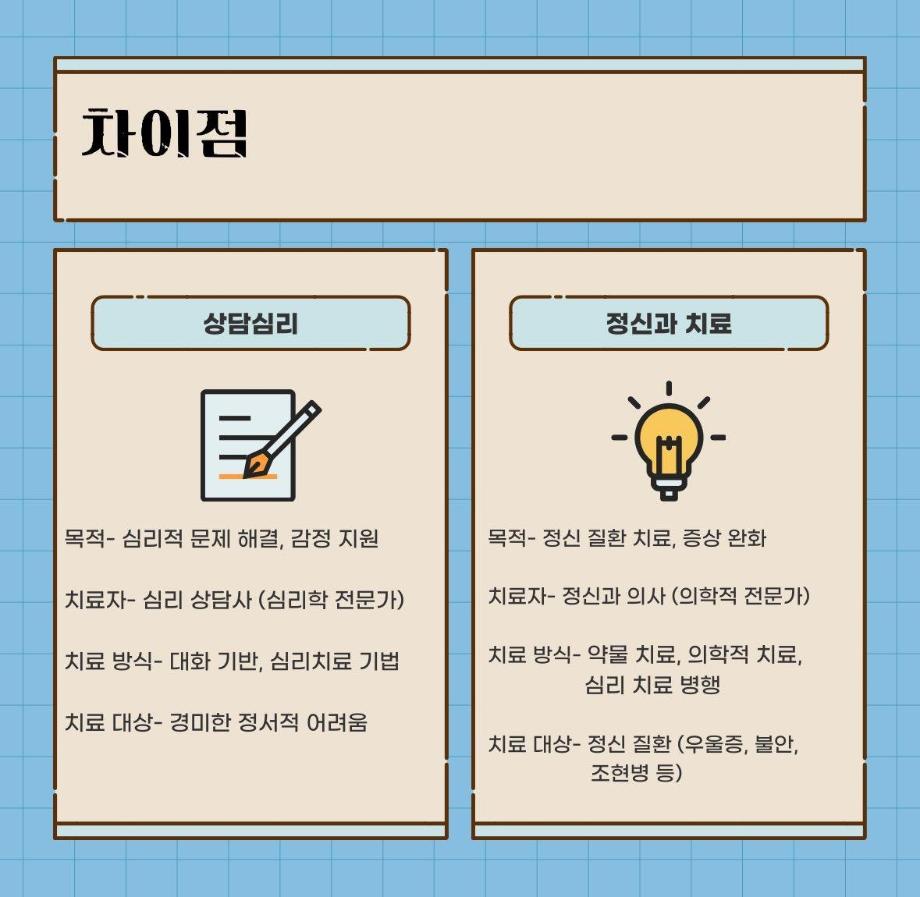 본문 시작 홈으로 학과 커뮤니티 학부소개 교수소개 교육목표 입학안내 학과 커뮤니티 대학원 커뮤니티 홈페이지가이드 학과 갤러리 학과소식 학사일정 학과 갤러리 학과 갤러리 페이스북 트위터 프린트 상담심리와 정신과 치료의 차이점을 알려줘! 상담심리학과 1413 2025-01-08 목록 이전석·박·학사 연합 전공특강 (동물매개치료) 다음 감정 표현의 중요성 만족도조사 만족도 조사 이 페이지에서 제공하는 정보에 대하여 만족하시나요? 매우만족 만족 보통 불만족 매우불만족