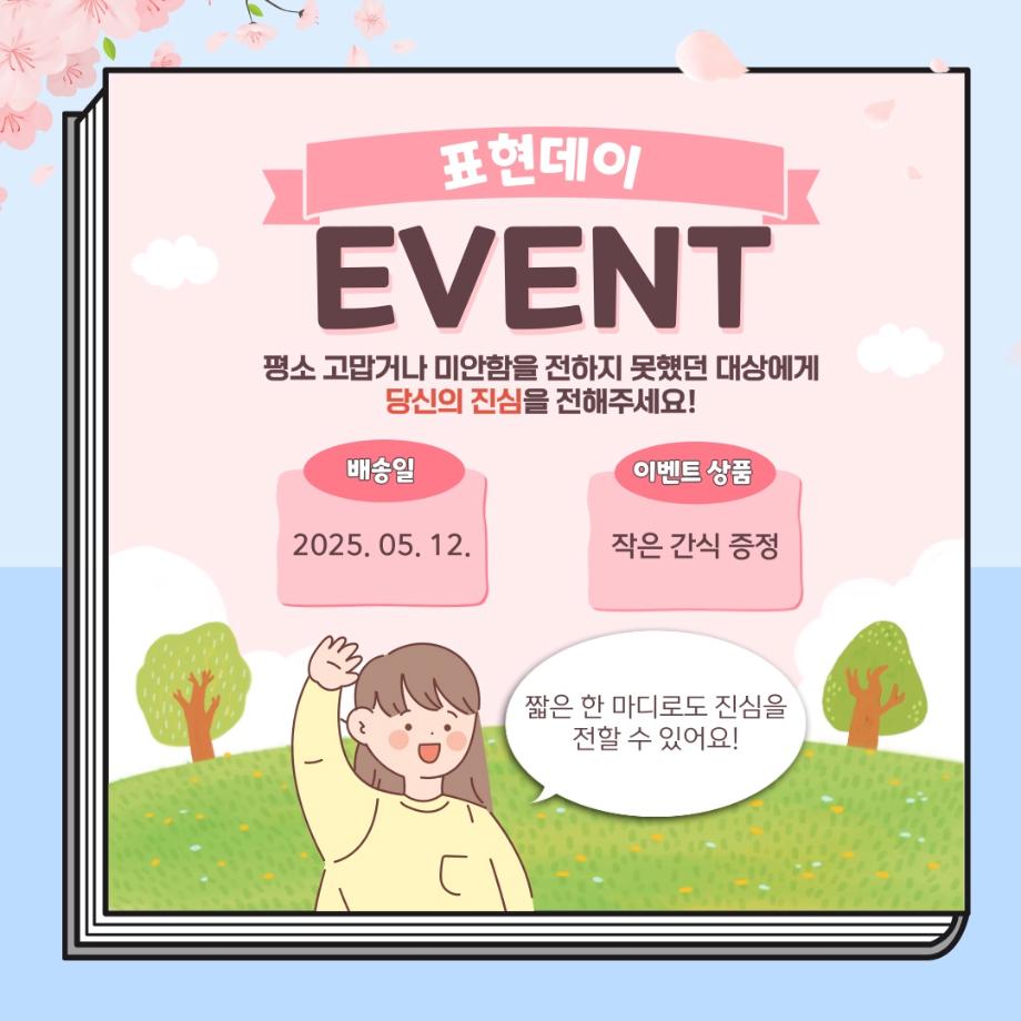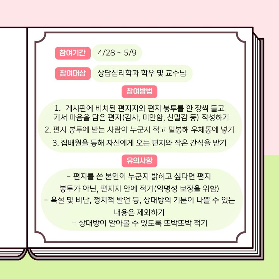 본문 시작 홈으로 학과 커뮤니티 학부소개 교수소개 교육목표 입학안내 학과 커뮤니티 대학원 커뮤니티 홈페이지가이드 학과 갤러리 학과소식 학사일정 학과 갤러리 학과 갤러리 페이스북 트위터 프린트 상담심리학과 표현데이 이벤트 상담심리학과 471 2025-04-29 안녕하세요 세명대학교 상담심리학과입니다! 여러분은 평소 고마웠던 마음이나 미안했던 감정을 전하고 싶었지만 말로 표현하기 어려웠던 순간이 있나요? 학과 동아리 GRIT에서 여러분의 따뜻한 마음을 전할 수 있도록 작은 이벤트를 준비했습니다! 참여기간: 4/28 ~ 5/9 참여대상: 상담심리학과 학우 및 교수님 짧은 한 마디로도 진심을 전할 수 있습니다! 많은 관심 부탁드립니다 :) 목록 다음 2025 상담심리학과 MT 다음 상담심리학과 표현데이 활동 소감 만족도조사 만족도 조사 이 페이지에서 제공하는 정보에 대하여 만족하시나요? 매우만족 만족 보통 불만족 매우불만족