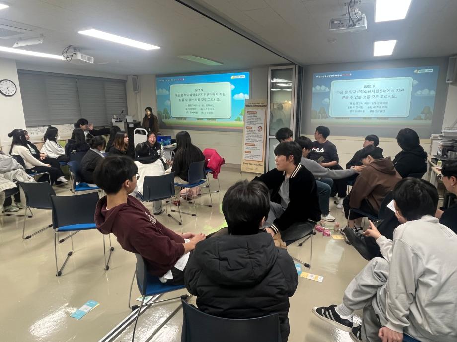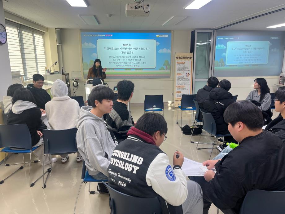 본문 시작 홈으로 학과 커뮤니티 학부소개 교수소개 교육목표 입학안내 학과 커뮤니티 대학원 커뮤니티 홈페이지가이드 학과 갤러리 학과소식 학사일정 학과 갤러리 학과 갤러리 페이스북 트위터 프린트 2025학년도 2학기 현장견학 상담심리학과 522 2025-11-20 안녕하세요 세명대학교 상담심리학과입니다! 지난 3일 상담심리학과 1, 2학년 학생들은 제천시청소년상담복지센터로 현장견학을 떠났습니다! 센터 견학과 퀴즈 프로그램을 통해 상담복지센터에 대해 알 수 있는 뜻깊은 시간이 됐습니다. 오늘의 견학이 앞으로의 진로에 도움이 되고 결정할 수 있는 데에 필요한 시간이 되었으면 합니다 :) 목록 이전나와 어울리는 심리이론은? 다음 12월 학사일정 만족도조사 만족도 조사 이 페이지에서 제공하는 정보에 대하여 만족하시나요? 매우만족 만족 보통 불만족 매우불만족